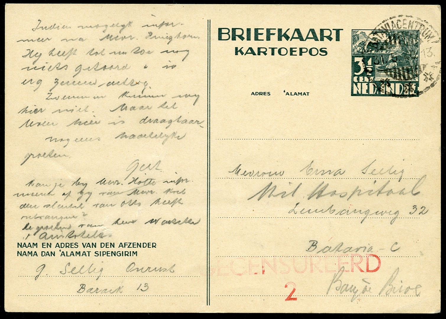 Interneringskampen. Onrust. Gecensureerde bk. van een geïnterneerde Duitser op 25-5-1940 geschreven, via Bataviacentrum 31-5 naar zijn vrouw in Batavia-C., doorgez. naar het militair hospitaal bij het kamp Banjoebiroe. Van Onrust is geen kampstempel bekend
