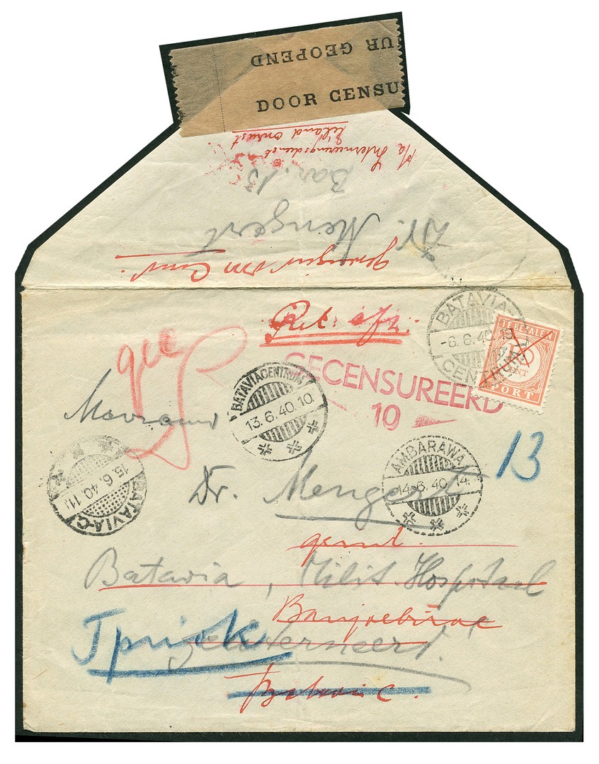 Interneringskampen. Onrust. Env. uit juni 1940 van Dr. Mengert, Barak 13, naar zijn vrouw, en na omzwervingen en niet inbaar port retour afzender, ´p/a Interneeringsdienst Eiland Onrust´. Interessante (post)historische puzzel