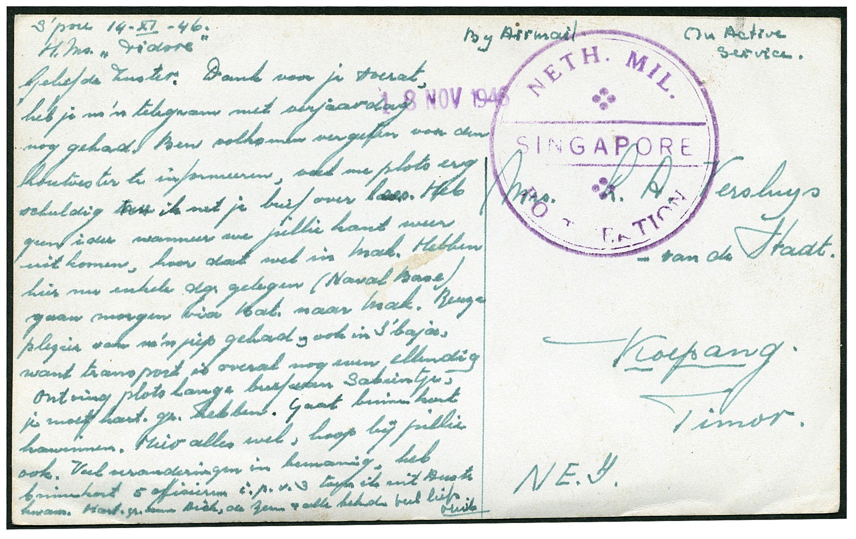 Rondstempel ´NETH. MIL./POST SECTION/SINGAPORE´ met datum 18 NOV 1946 op prentbk. door militair O.A.S. geschreven a/b H.Ms.´Tidore´ per luchtpost naar een geliefde zuster in Koepang