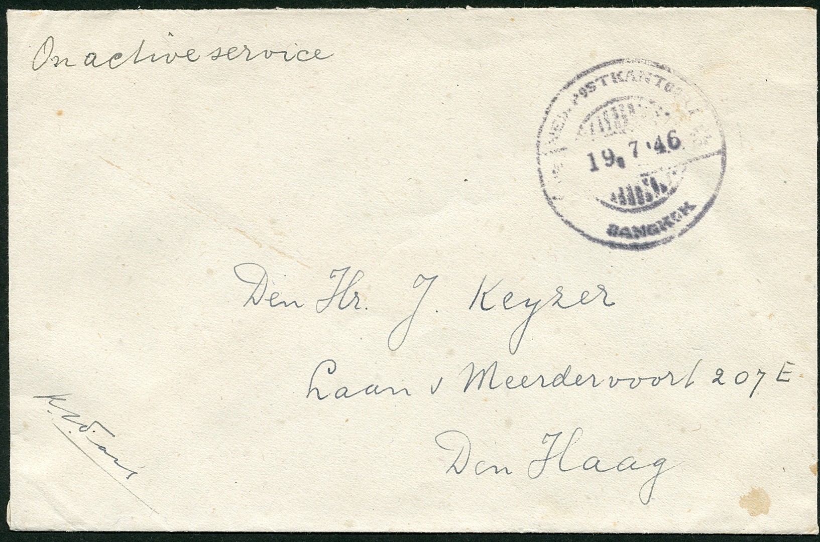 Env. van militair K.A. Faatz met als afz. ´Sportclub Bangkok´ afgest. ´NED. POSTKANTOOR/BANGKOK´ op 19-7-1946 naar Den Haag