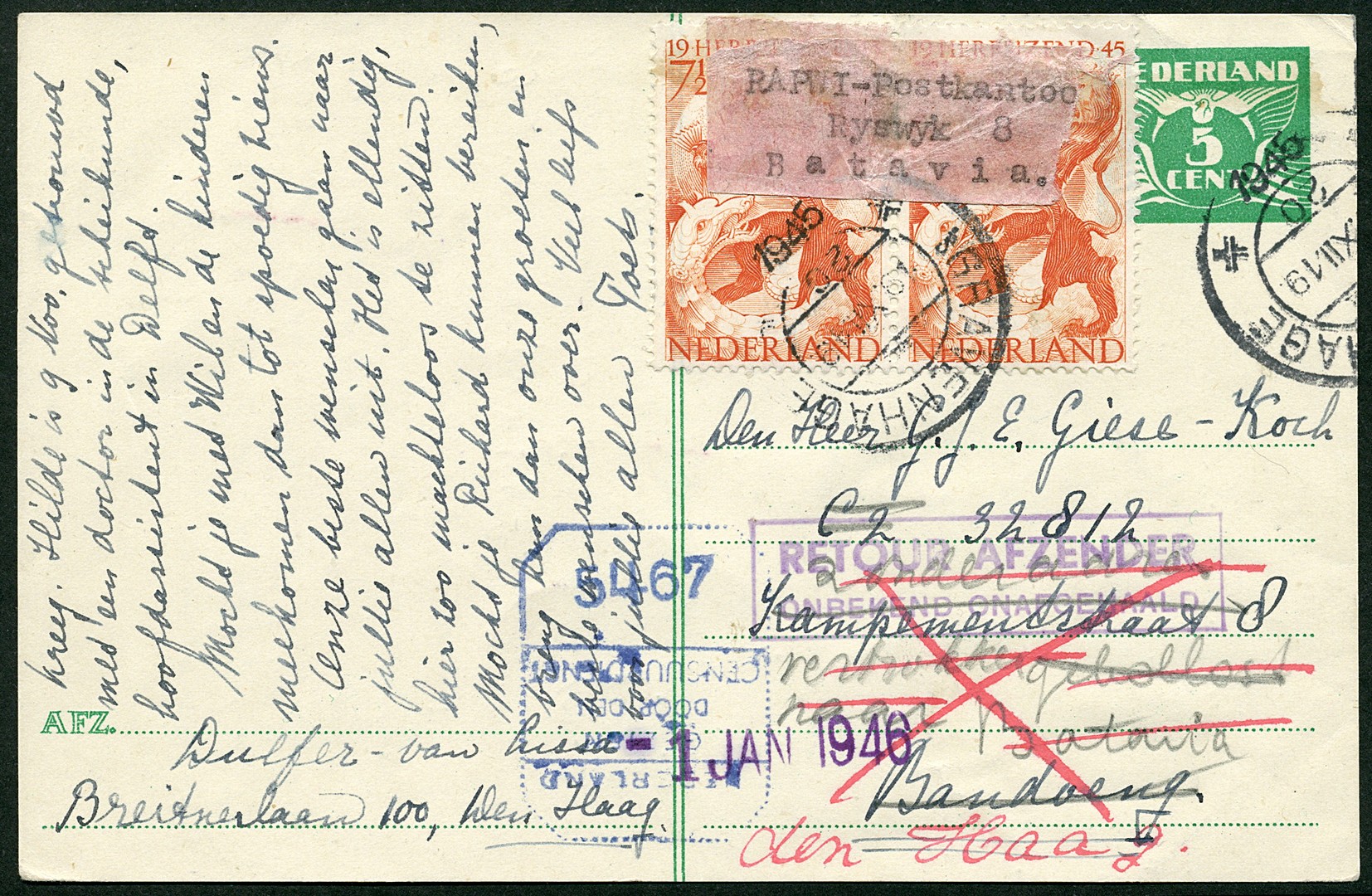 Ned. bk. G271 bijgefr. met Bevrijdingszegel in paar van ´sGravenhage 19-12-1945 (kopstaand jaartal), gecensureerd, op zoek naar de geadresseerde in Indië, via het RAPWI-Postkantoor in Batavia retour. Zeldzaam roze strookje!