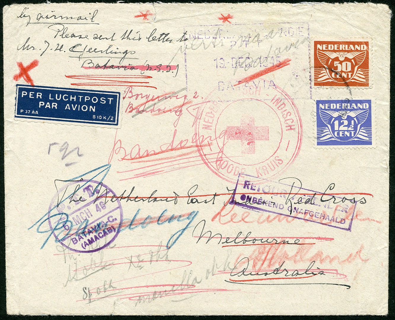 Brief, met boeiende inhoud, van Vlieland 20-12-1945 per luchtpost naar het ´Netherlands East Indies Red Cross´ te Melbourne, met verzoek de geadresseerde te vinden, met als resultaat allerlei postale notities en vooral Amacab- en Rapwi-stempels, uiteindelijk retour op 6-3-1946. Een brief die, ook door zijn inhoud, alles samenvoegt van deze periode uit de geschiedenis