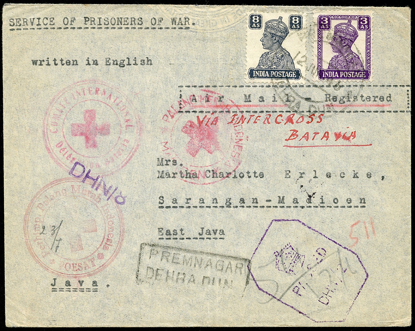 Rode Kruis. Env. van een geïnterneerde POW in Premnagar, Dehra Dun (India) op 12-6-1946 over Batavia Amacab 15-7 via het Internationale Rode Kruis te Batavia overgedragen aan het Indonesische RK en doorgez. naar het RK te Madioen met bestemming een mrs. in Sarangan