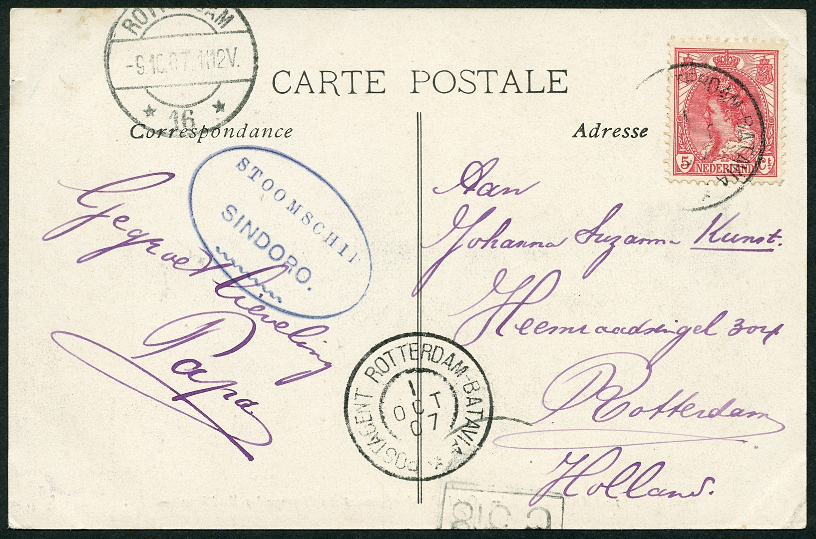Zeer schaarse ovaalstempels van schepen van de Rotterdamsche Lloyd op drie prentbriefkaarten, ´S.S./Gorontalo´ in violet (1912), ´s.s./Palembang´ in violet (1926) en ´STOOMSCHIP/SINDORO´ in blauw (1907)