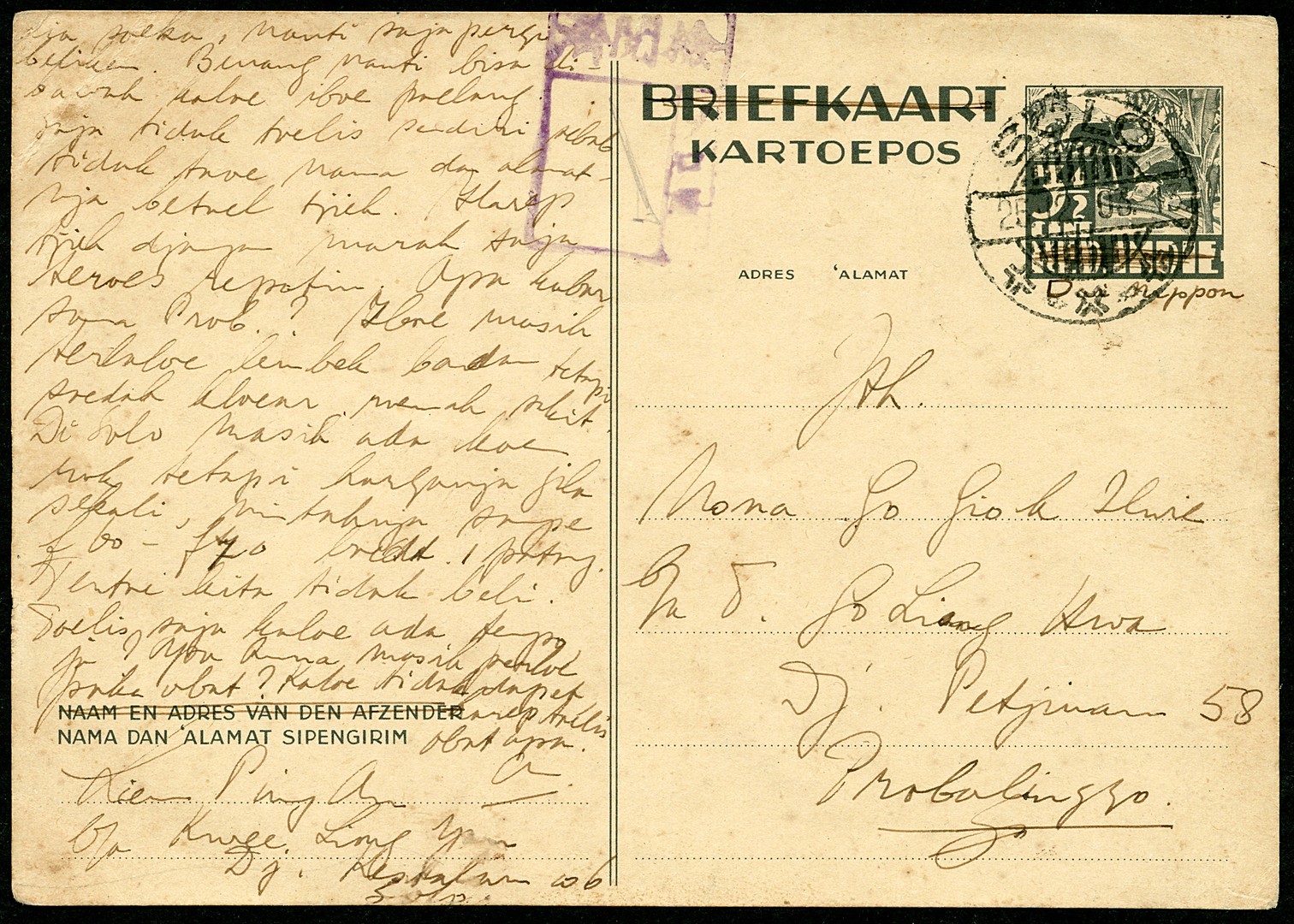 Java. 3½ Cent postcard with 'Ned. Indie' crossed out and hand-written underneath 'Dai Nippon', from Solo 25.12.03 to Probolinggo. Only a few copies recorded (Bu.J1c, RRR)