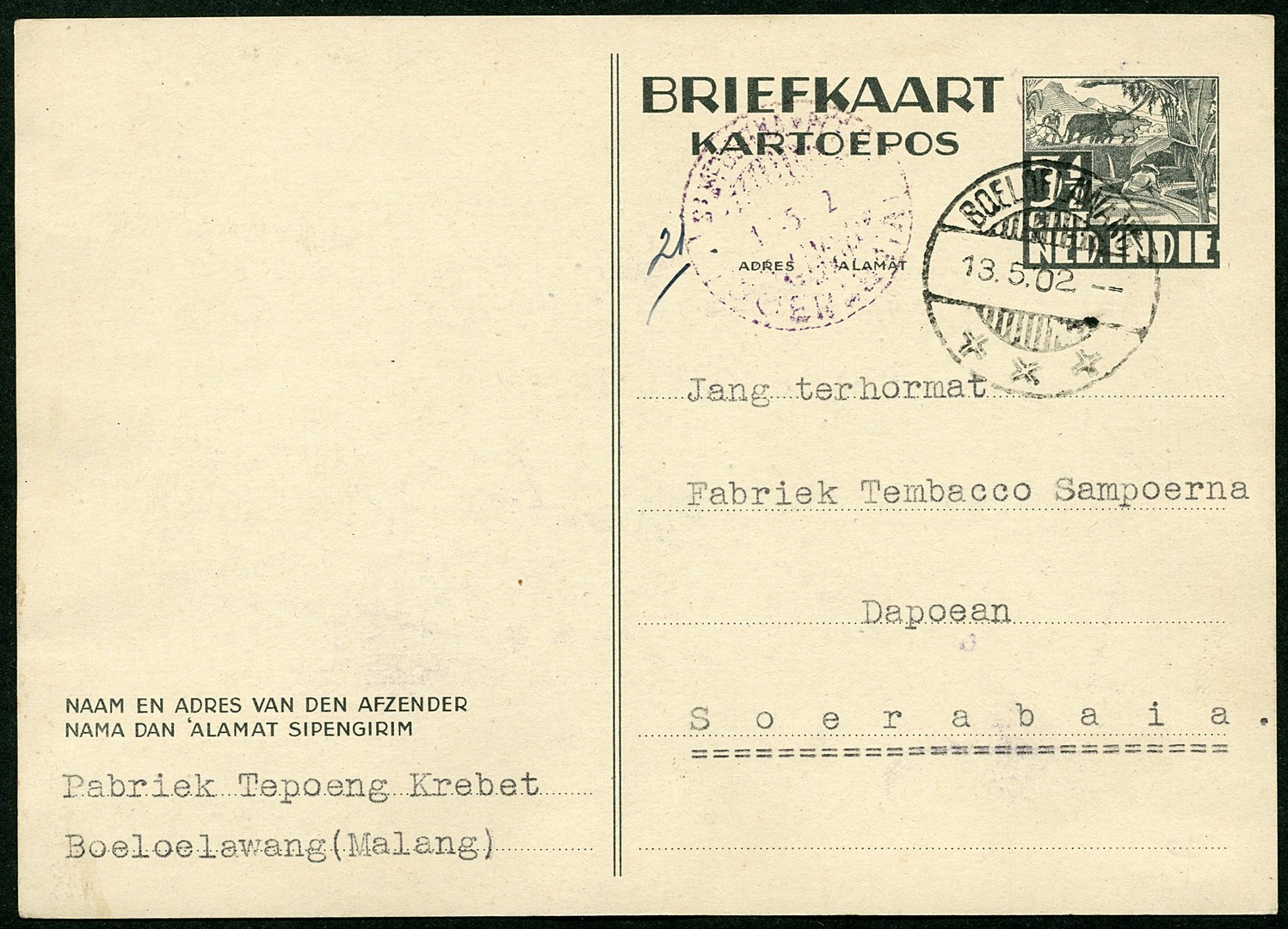 Java. 3½ Cent postcard from the flour mill Krebet in Boeloelawang 13.5.02 to the tobacco factory Sampoerna in the village of Dapoean near Soerabaja, showing in violet a mysterious cds 'Sampoerna*Pos(?)/Soerabaia' 14.5.2 (from the tobacco factory or postal?). Only two recorded