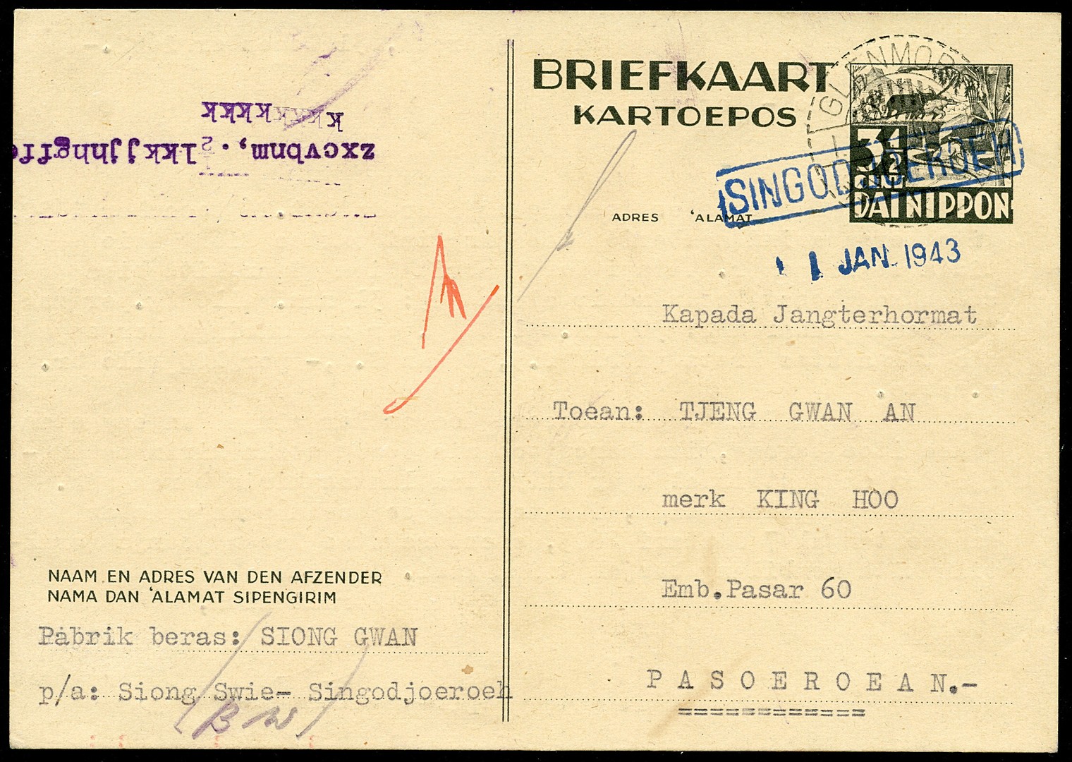 Java. SINGODJOEROEH train-halt pmk in blue with date 1 JAN. 1943 on censored 3½c postcard Bu.1a via Glenmore 1.1.03 to Pasoeroean. Superb strike! (vNV.RR)