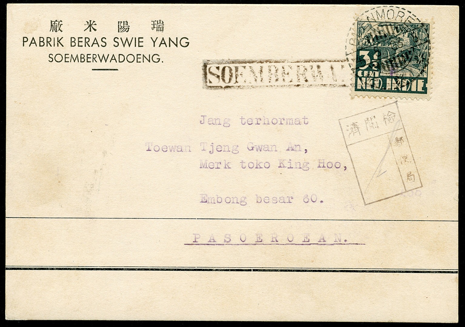 Java. SOEMBERWADOENG train-halt pmk on censored postcard bearing 3½c via Glenmore 4.8.03 to Pasoeroean (vNV.RR)