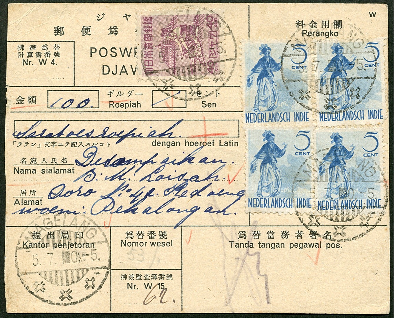 Java. 5 Cent dancer (4x) and 40c definitive on M.O. Bu.JF23 from Magelang 5.7.0.-5 to Kedoengwoeni 7.7.05. This postal rate was in use since 1 July 1945 thus only some 45 days during the Japanese occupation