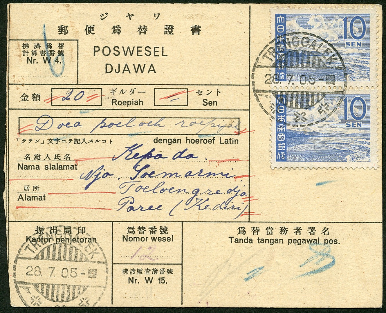 Java. 10 Sen commemorative no. 004 in pair on M.O. Bu.JF23 from Trenggalek 28.7.05 to Paree 31.7.0.5. This postal rate was in use since 1 July 1945 thus only some 45 days during the Japanese occupation