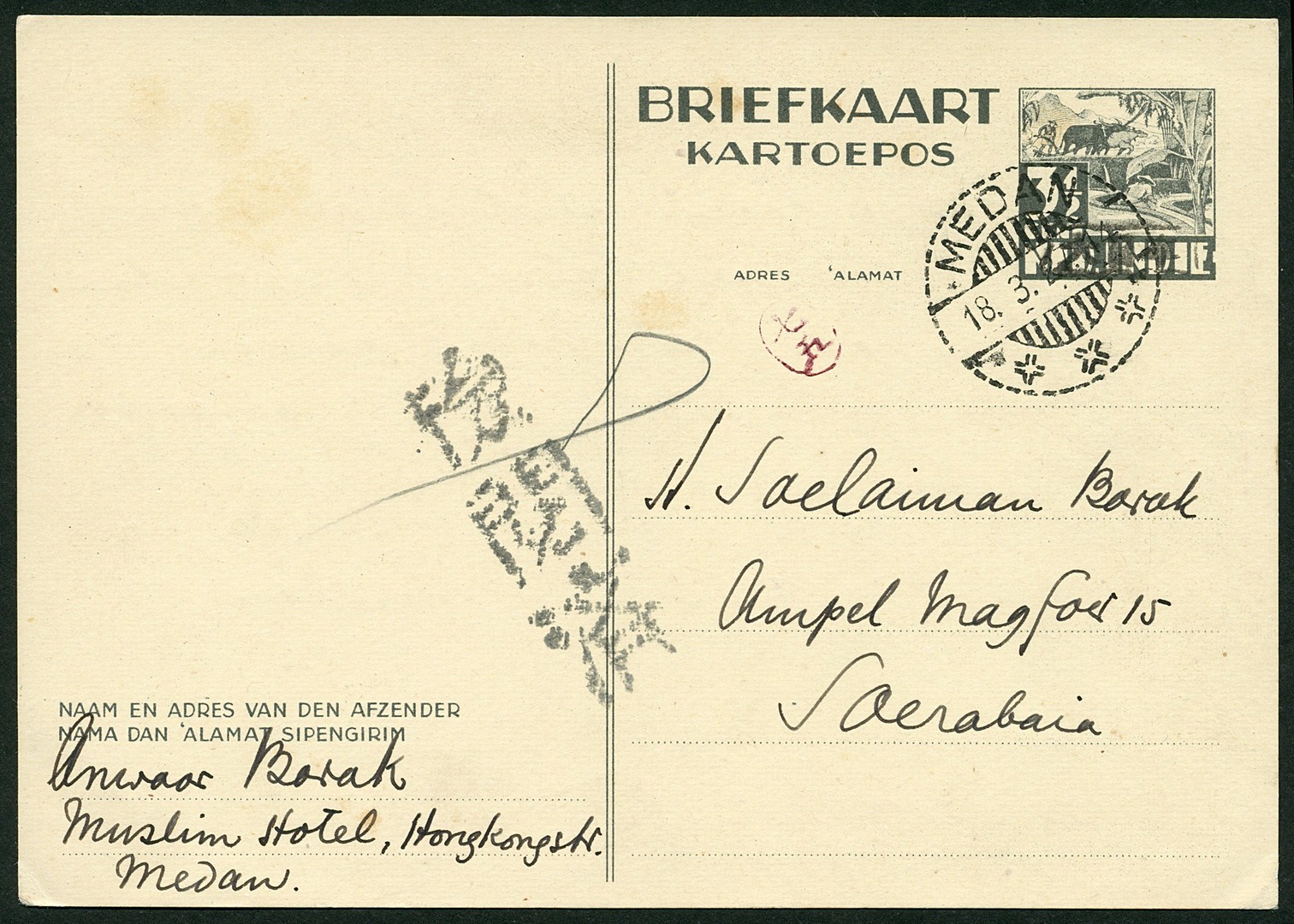 Sumatra. East Coast. 3½ Cent postcard with Dai Ni Hon overprint in wavy frame Bu.164g from Medan 18.3.27 to Soerabaja, censor Vr.102b