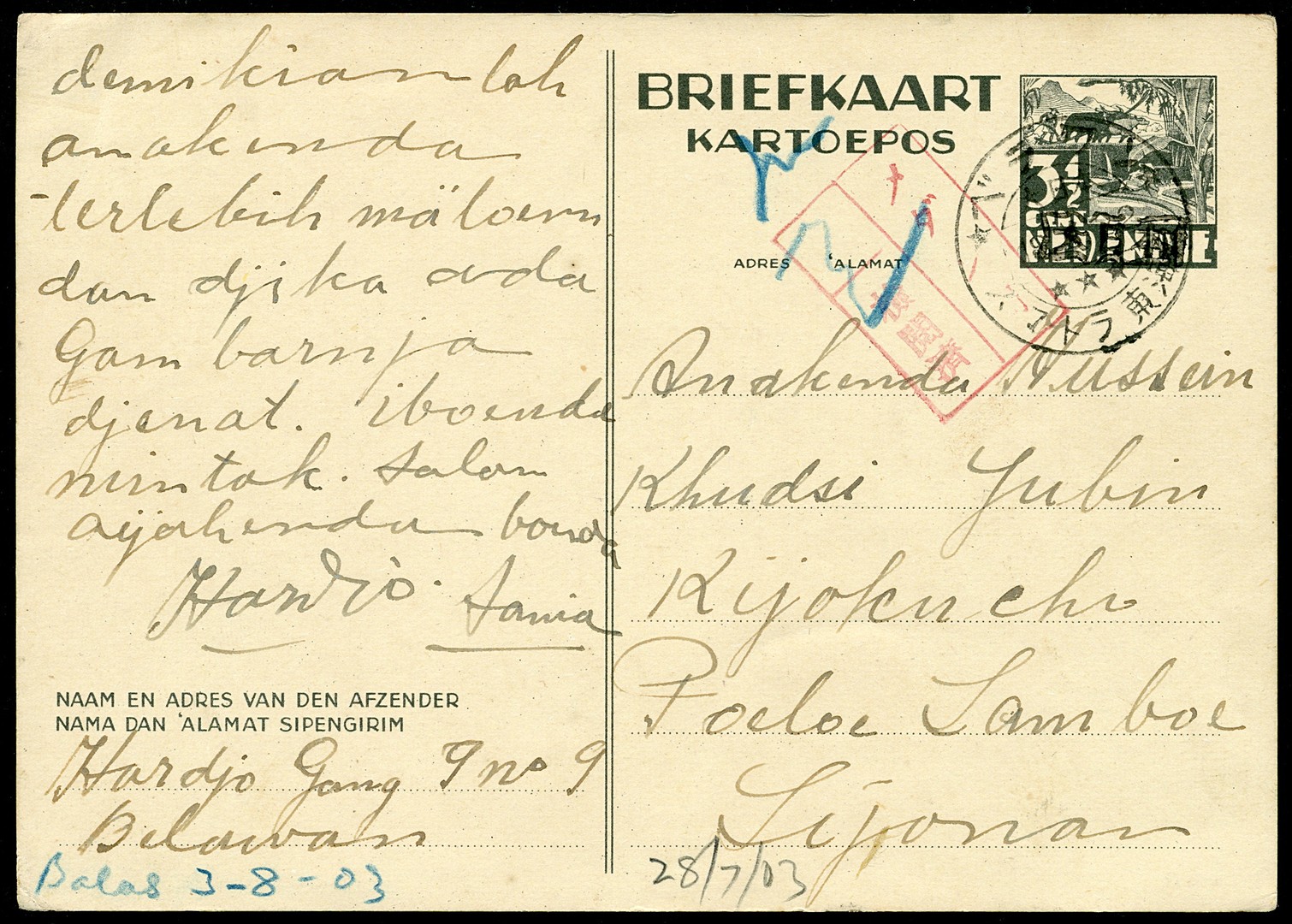 Sumatra. East Coast. 3½ Cent postcard with Dai Ni Hon overprint in wavy frame Bu.164g from Belawan 18.6.22 (type 200) to Poeloe Samboe (just south of Syonan=Singapore). Censor Bu.JC14a of Medan