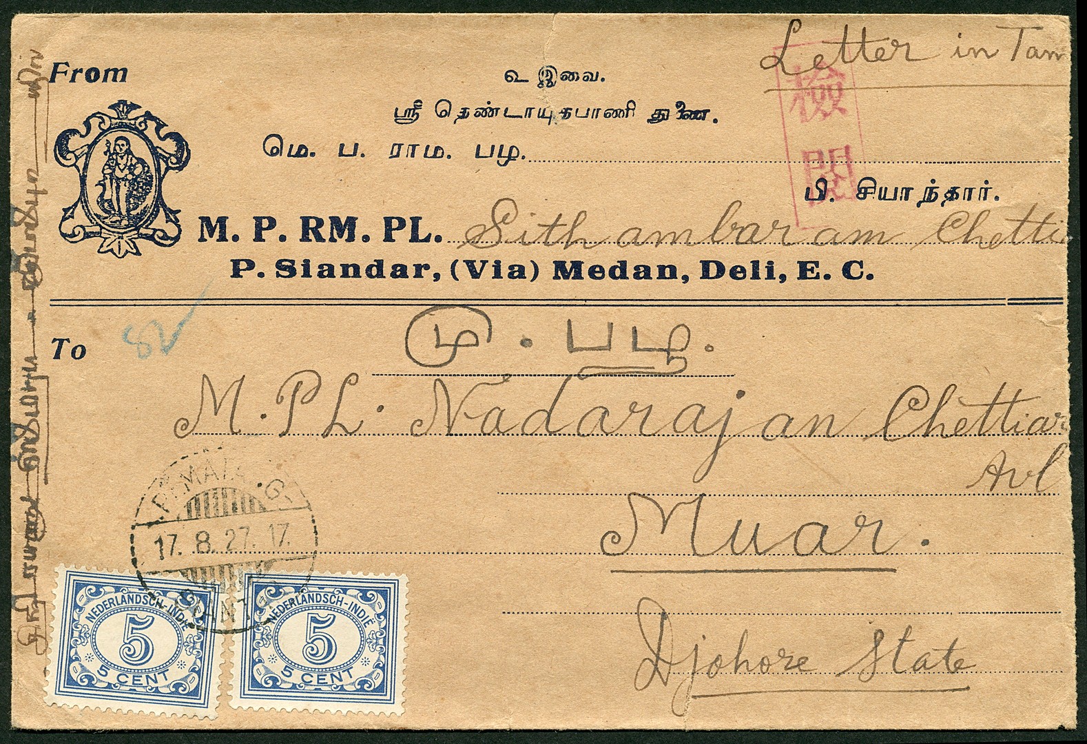 Sumatra. East Coast. 5 Cent Numeral (2x) without overprint (not yet available) on company cover from Pematang-/siantar 17.8.27 to Muar, Djohore, and censored in Medan