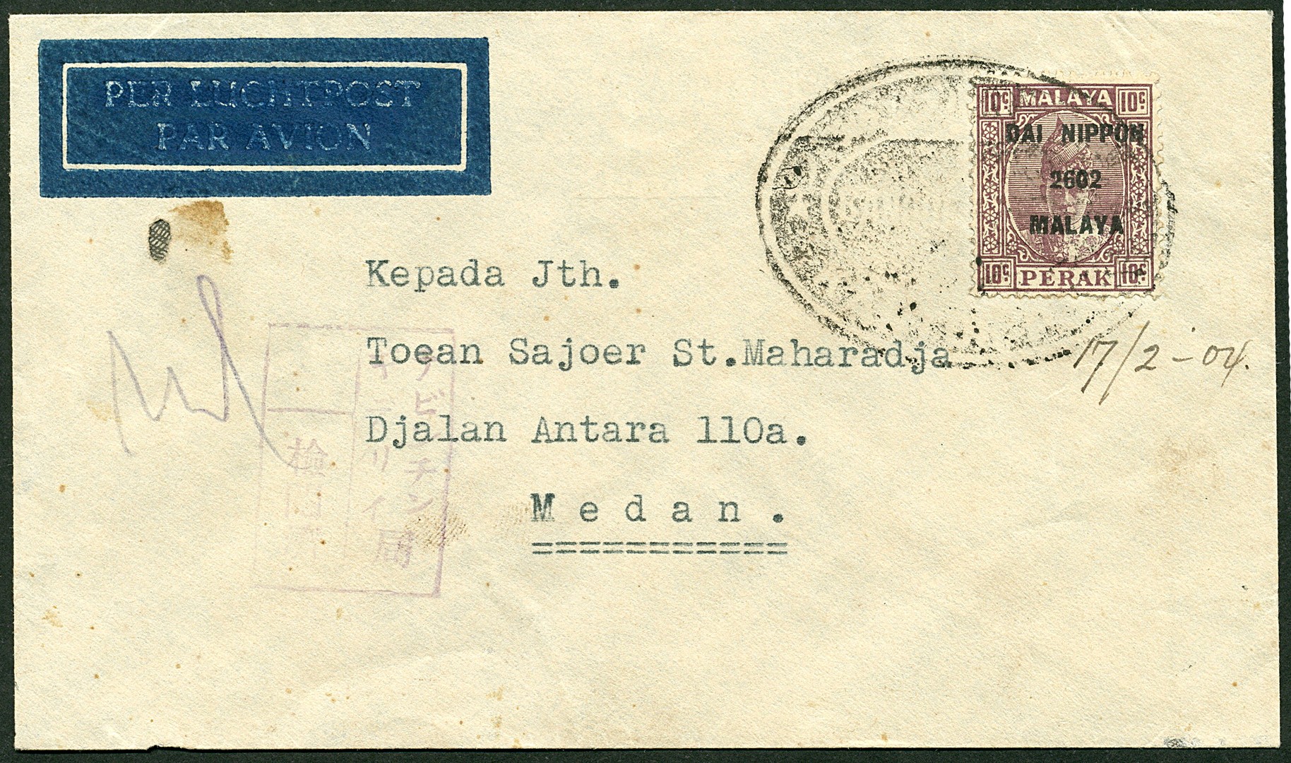 Sumatra. East Coast. 10 Cent Perak on censored cover tied by oval negative pmk of Bangoenpoerba (type 091) with written date 17/2-04 to Medan