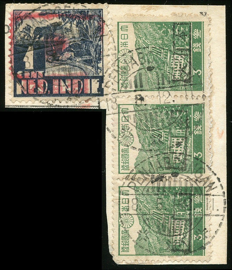 Sumatra. Tapanoeli. 1 Cent Kreisler with red Dai Ni Hon overprint in frame and purple Hinomaru Flag no. 821r/211p-15a, and 3s J4 with black Dai Ni Hon overprint in frame, on M.O. fragment cancelled Penjaboengan 18.5.12. Unusual 10 cent franking. ? 131