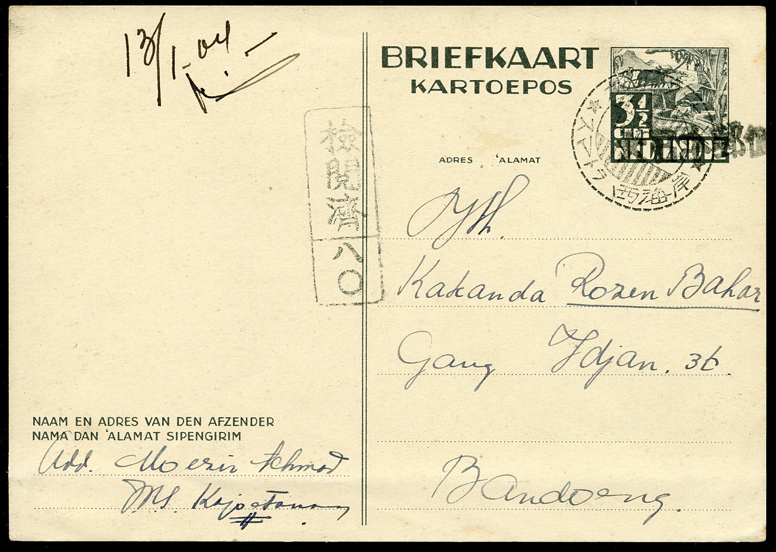 Sumatra. West Coast. 3½ Cent postcard with black large Dai Ni Hon overprint Bu.175a from Kajoetanam 18.12.21 to Bandoeng. Censor Vr.201 of Palembang