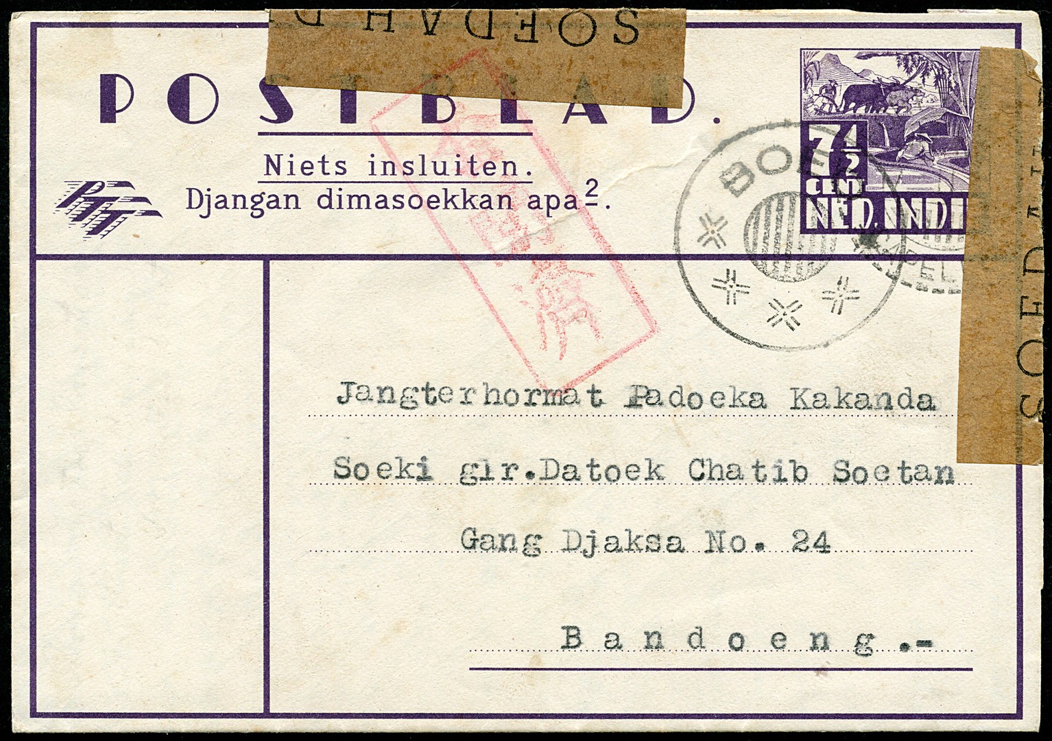Sumatra. West Coast. Letter sheet in offset printing without overprint from the delivery house BOEO via Fort van der-/Capellen 17.11... to Bandoeng. Censor mark Bu.JC13a and label Vr.505a. Wonderful strike of the delivery house pmk