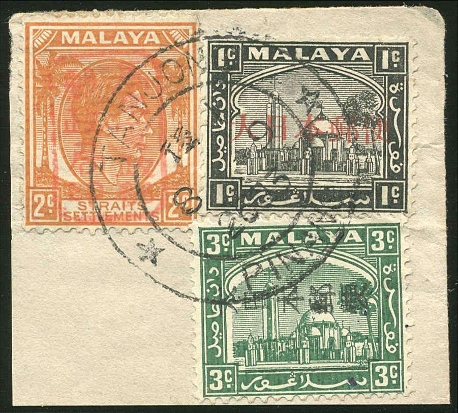 Sumatra. Riouw. 2 Cent Straits Settlements with Japanese chop 121r-M2, 1c Selangor with red Dai Ni Hon Yubin 351r-M1 and 3c Selangor with black Dai Ni Hon Yubin 311z-M4 on piece from Tandjong Pinang 8.9.2603. Extremely rare use in the Neth east Indies, the 1c Selangor probably unique. ? 1000