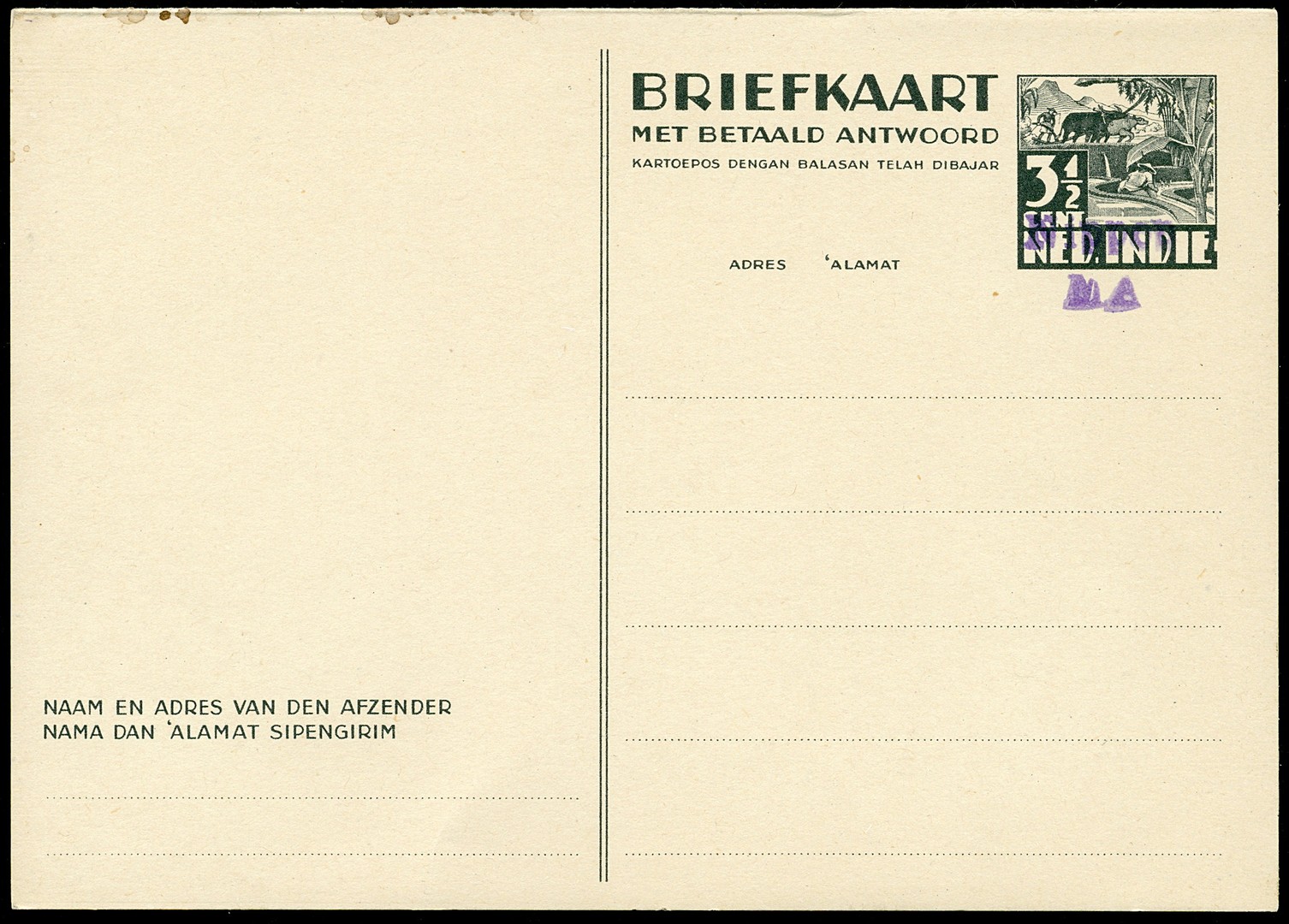 Sumatra. Djambi. 3½ Cent postcard with reply-paid card with violet overprint 'Nippon/MA' Bu.123 (only known unused)