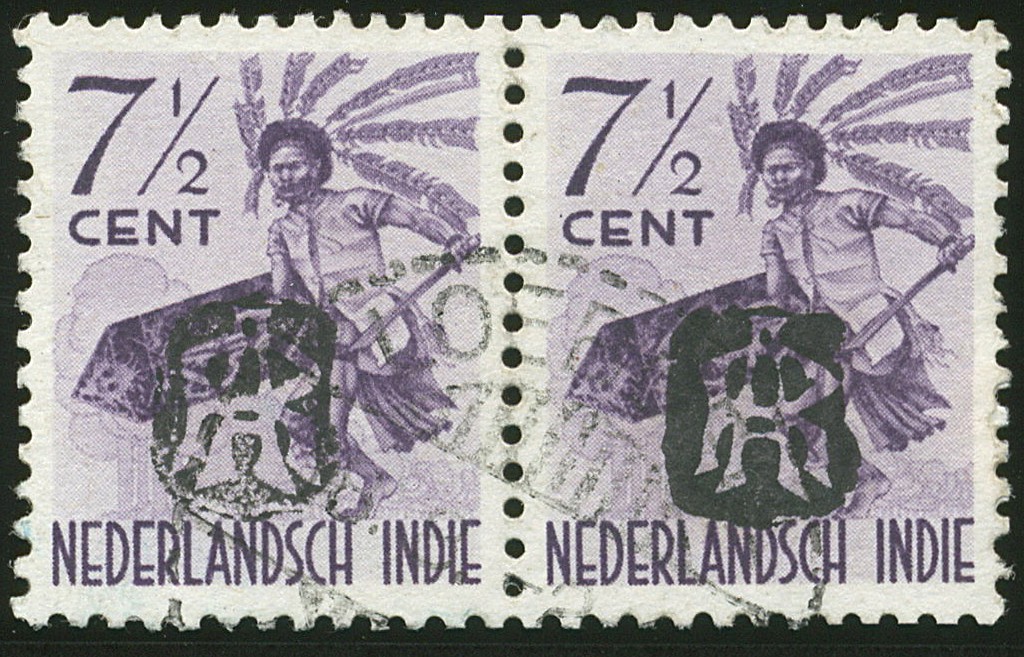 Sumatra. Palembang. 7½ Cent dancer in pair with Arifin signet ring overprint in black no. 521z-71, cancelled Loeboek-/Linggau 18.8.-2. ? 250