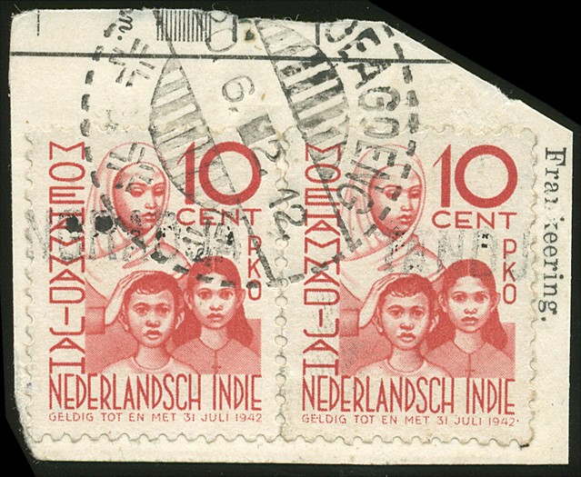 Sumatra. Palembang. 10 Cent Moehammadijah no. 547z-64 in pair showing the full straight-line overprint TANDJONGRADJA, used to validate stamps, on M.O. fragment cancelled Kajoeagoeng 20.6.2.12. Very rare and only two pairs recorded. ? 600++
