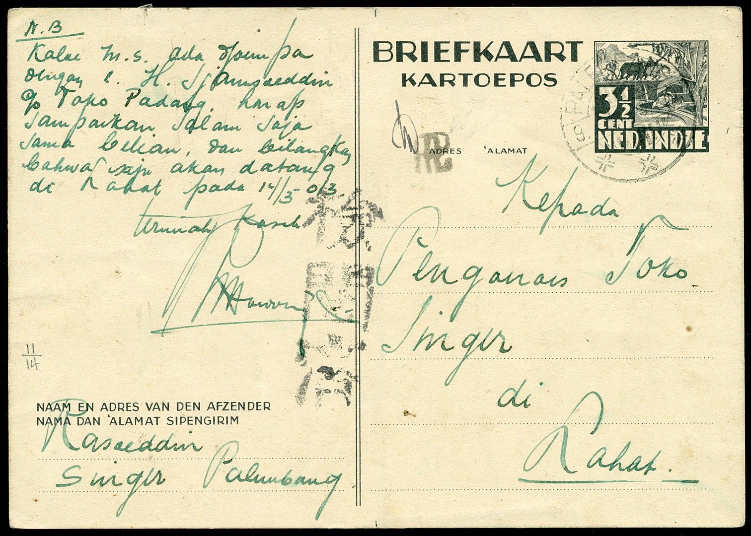Sumatra. Palembang. 3½ Cent postcard with large IPL overprint without frame in black Bu.56 from Palembang 9.3.3. (type 010) to Lahat, censor Vr.102b