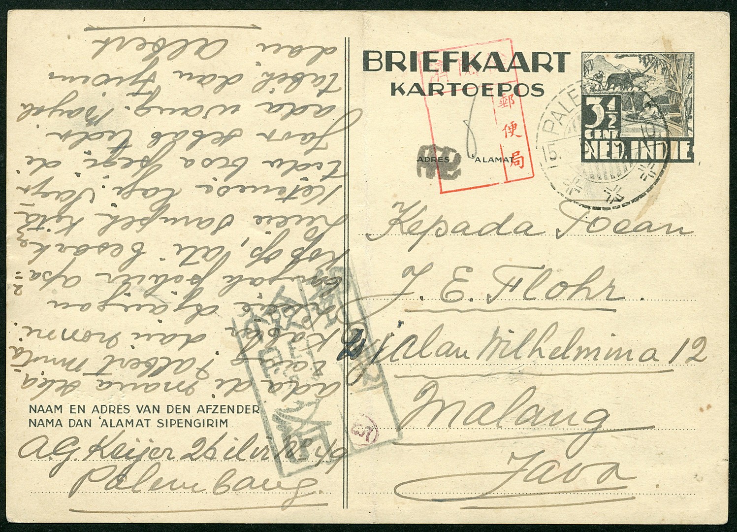 Sumatra. Palembang. 3½ Cent postcard with medium IPL overprint without frame in black Bu.56 from Palembang 15.5.3. (type 010) to Malang, censors Bu.JC14c (Palembang) and JC36 (Java)