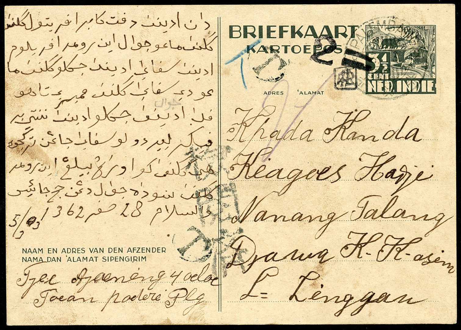 Sumatra. Palembang. 3½ Cent postcard with small IPL overprint in frame in black and re-valued with small 2= in black Bu.87 but marked 'T' because the rate has been increase to 3½ cent, sent from Palembang 8.3.3 (type 010) to Loeboek Linggau, censor Vr.102b