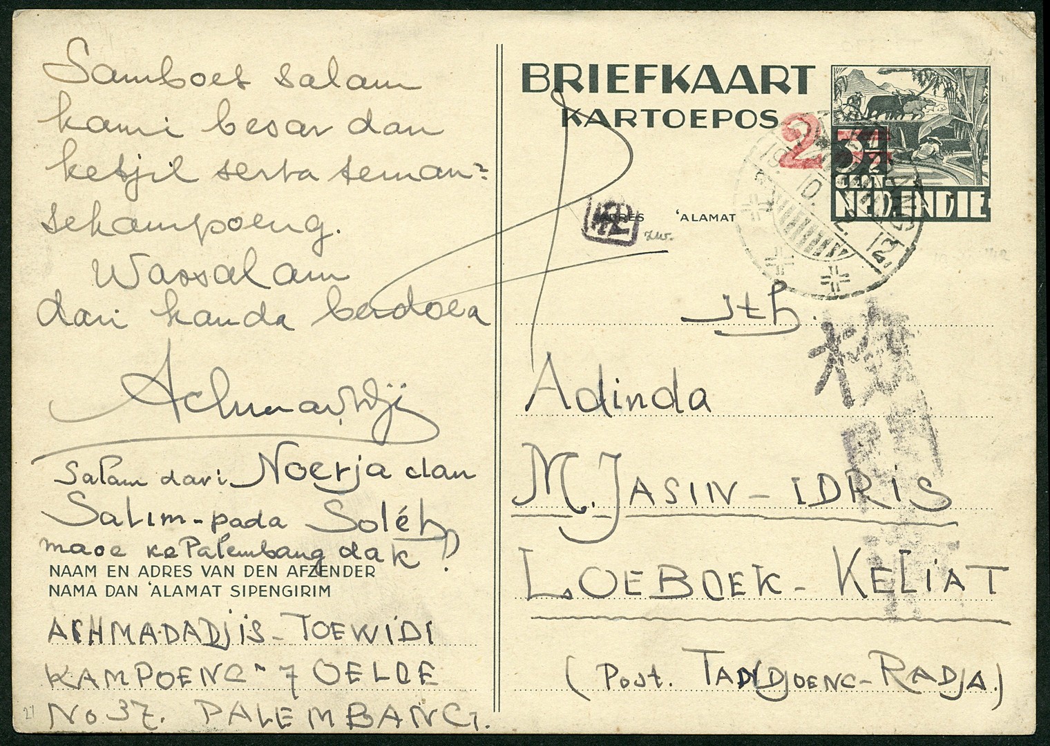Sumatra. Palembang. 3½ Cent postcard with small IPL overprint in frame in black and re-valued with small 2= in red Bu.88 from Palembang 19.10.2. (type 010) to Loeboek Keliat, near Tandjongradja, censor Vr.102b