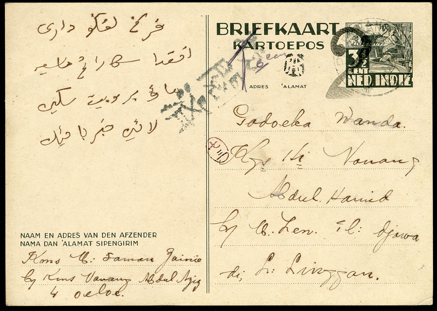 Sumatra. Palembang. 3½ Cent postcard with Arifin signet overprint in black and re-valued with large 2 in black from Palembang 9.4.3. (type 010) to Loeboek Linggau, censor Vr.102b. This postcard with only the Arifin and large 2 overprint is unlisted in Bu. (see Bu.100 which has a 3½ as well)