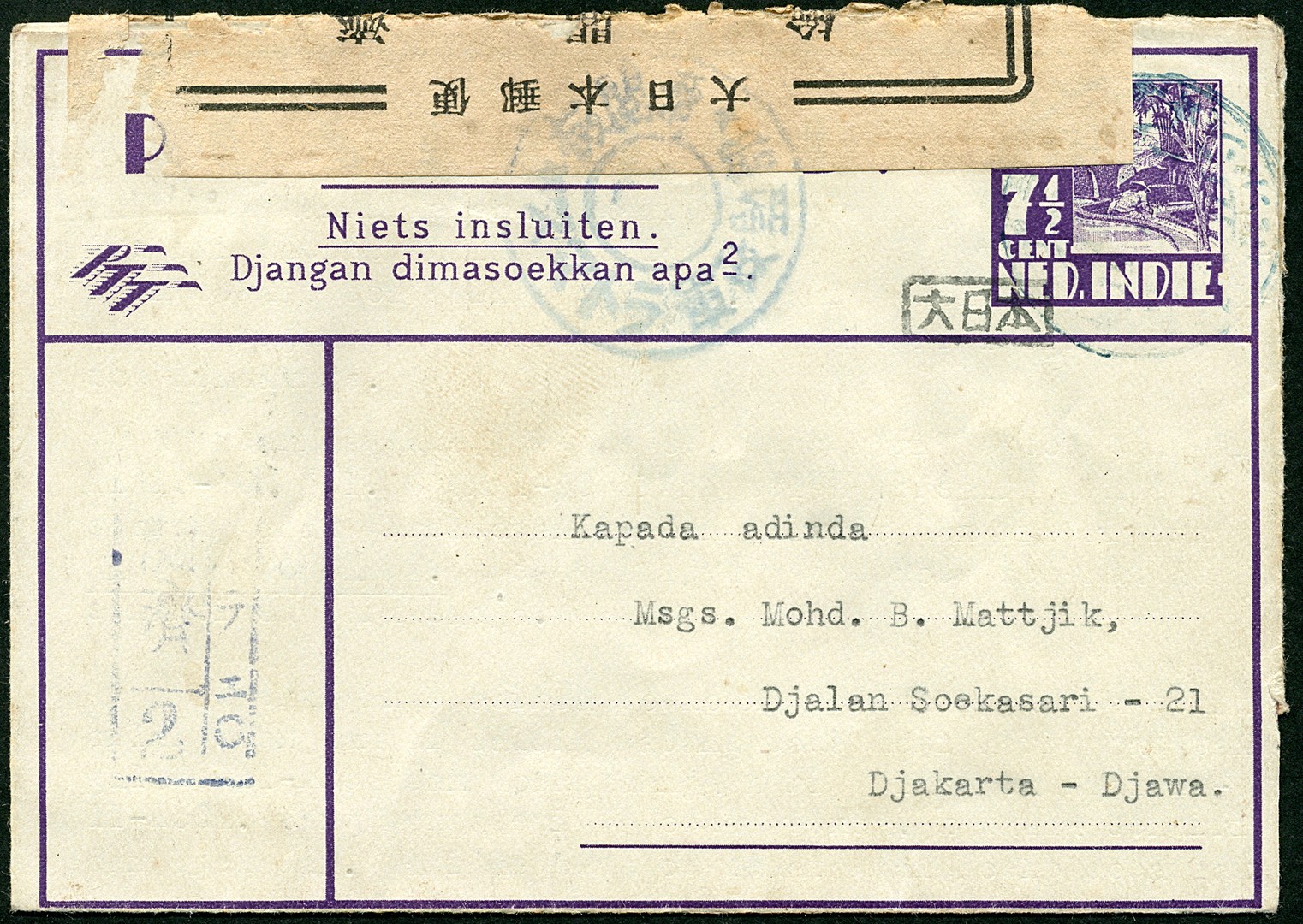 Sumatra. Palembang. 7½ Cent letter sheet in photogravure printing with Dai Ni Hon overprint in black type 825 (like Bu.167e but in photogravure) written on 10-12-2604 from Palembang to Djakarta. Censors Bu.JC15, censor label Vr.508 and blue Bu.JC17