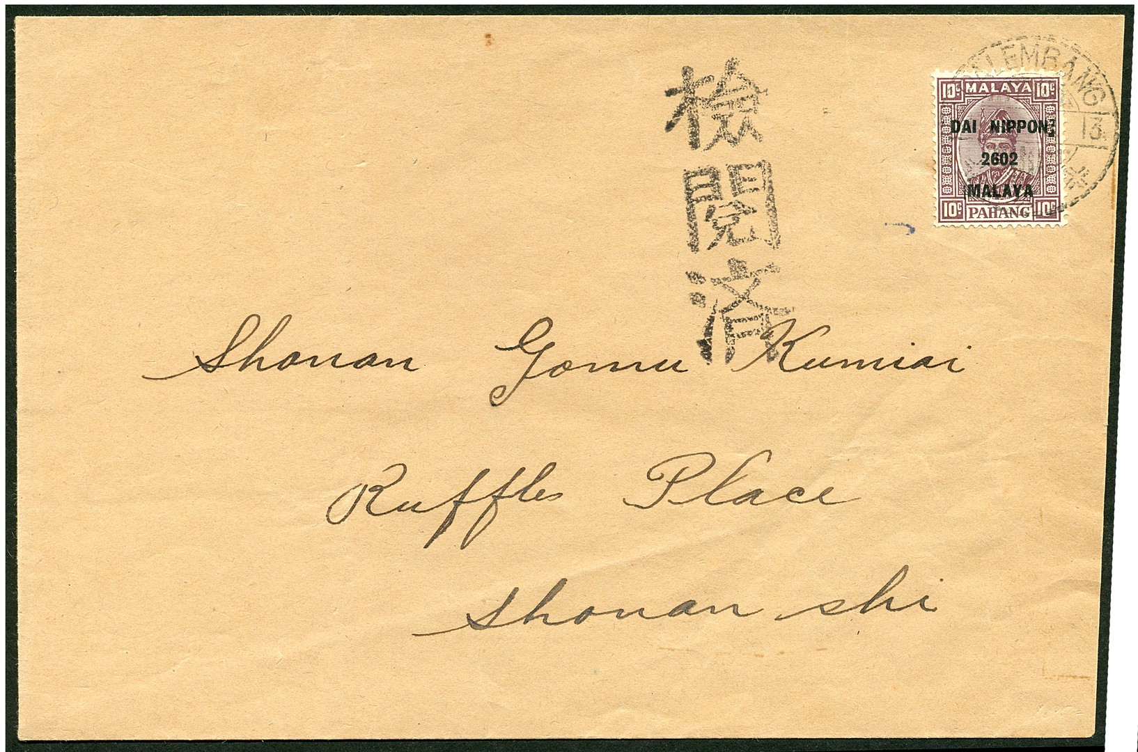 Sumatra. Palembang. 10 Cent Pahang M13 on cover (folded to reduce size) from Palembang 19.?.2? to Raffles Place in Singapore, censor Vr.102b