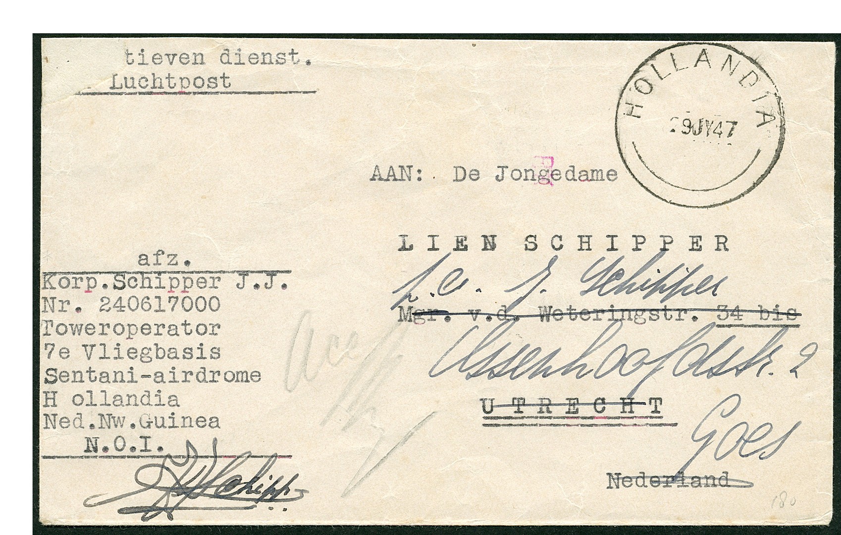 Env. met sublieme afdruk van het in Australië aangemaakte rondstempel Hollandia (Bu.X) op 29-7-1947 via Utrecht naar Goes