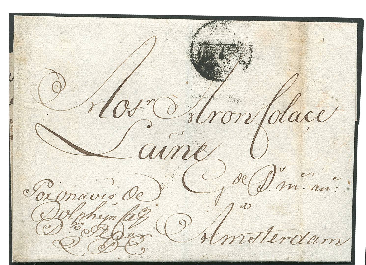 Briefomslag van Curaçao naar Amsterdam 25-6-1772 met gevlekte afdruk "GWC-6 stuiver"-stempel van de West-Indische Compagnie (K11-3) en geschreven "per Onavio Dolphyn"