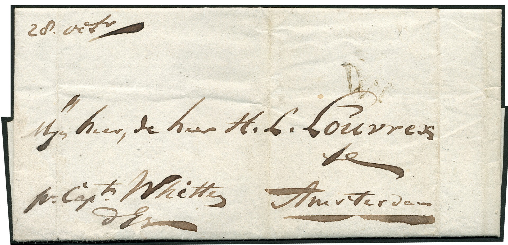 Cpl. Prachtbrief van Curaçao naar Amsterdam 28.10.1794, met op voorzijde afdruk van het zeer zeldzame "6ST WH"-stempel, zoals altijd onduidelijk! (Julsen no.6)