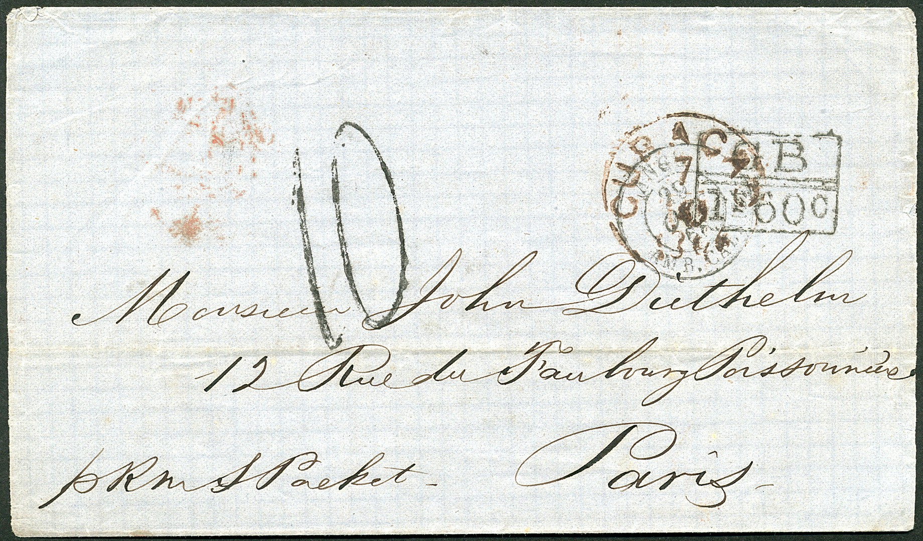 Briefomslag met rood rondstempel 'Curaçao 7-10-1866' (Julsen type 17) via Engeland naar Parijs met doorgangsstempel en portstempel "G.B.1fboc" in kastje. Schaars!