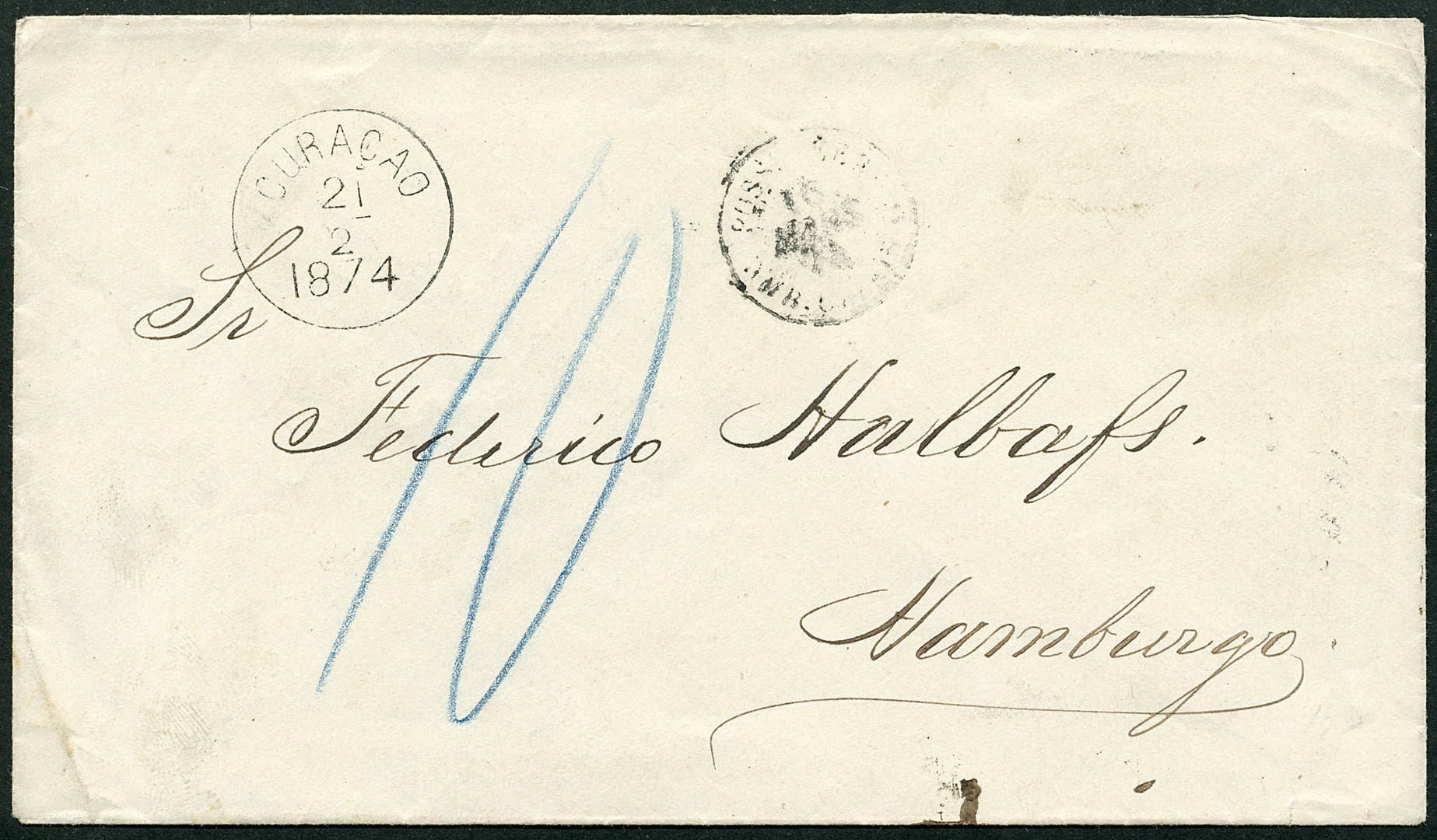 Briefomslag met rondstempel 'Curacao 21-2-1874" in zwart (Julsen no.20) naar Hamburg met a.k. op achterzijde