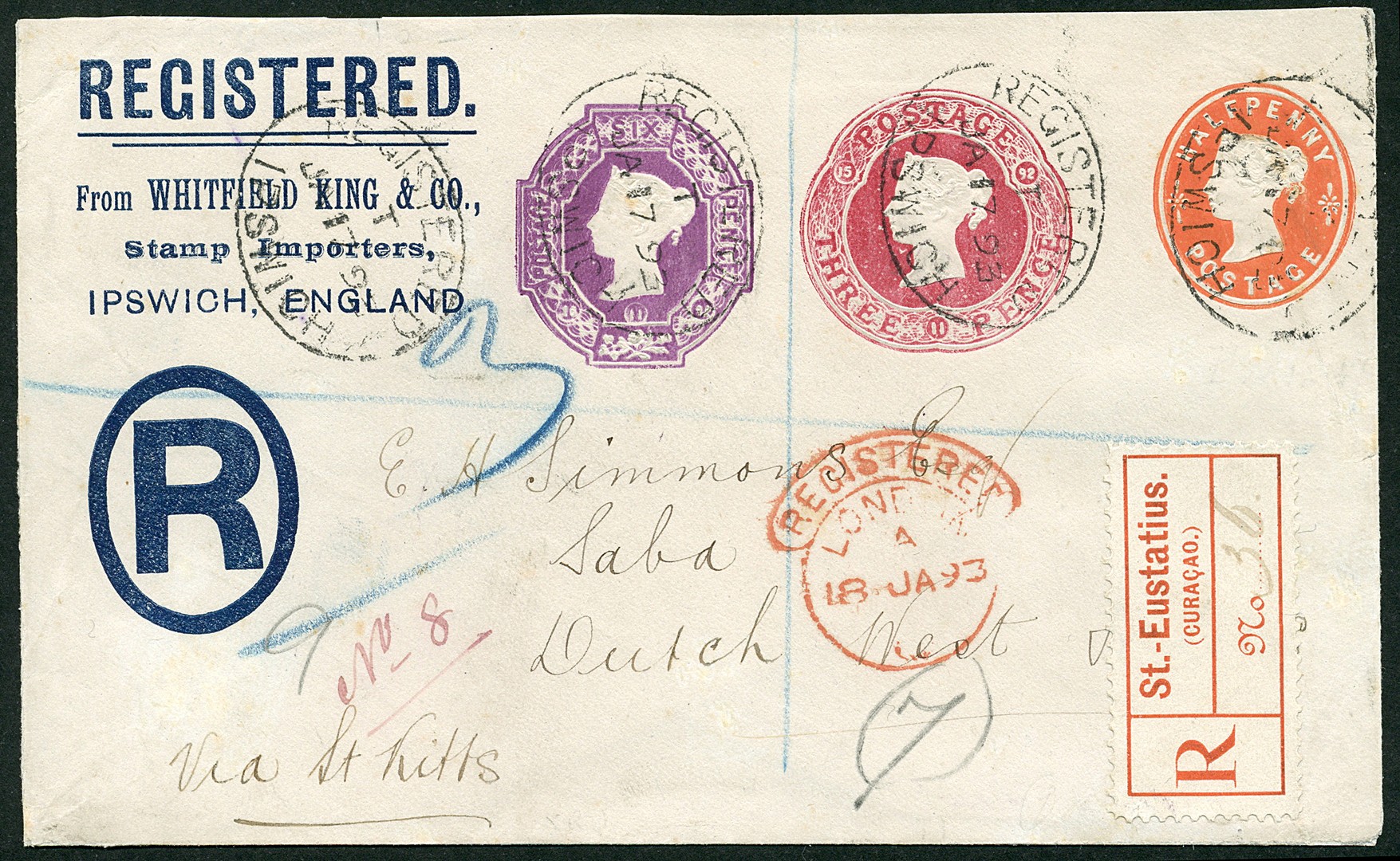 Incoming Mail. Aangetekend postwaardestuk uit Ipswich-Engeland 17-1-1893 over St. kitts en St. Eustasius naar Saba. Schitterend, kleurrijk geheel
