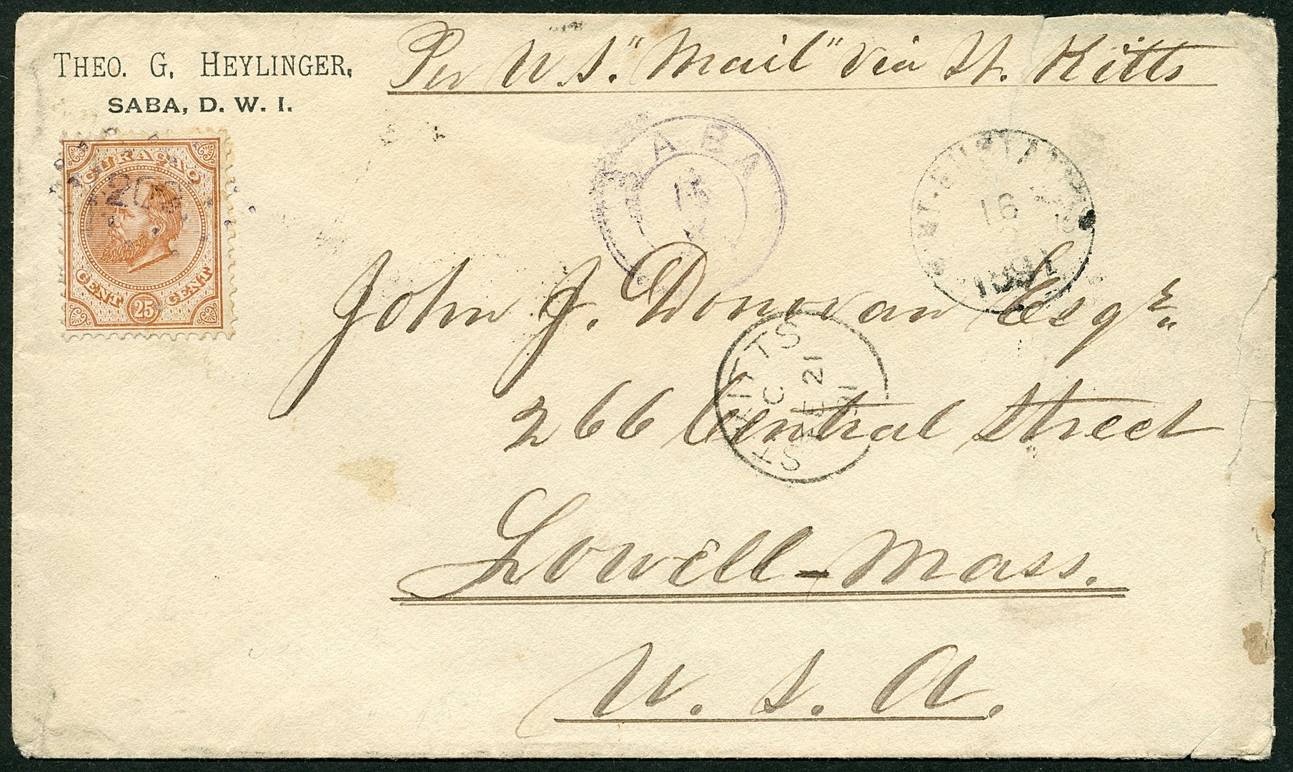 Fraaie briefomslag met 25 ct. Willem III en puntstempel 202 met het uiterst zeldzame kleinrondstempel 'SABA 15-2-1891' naar USA. Slechts enkele afdrukken van dit stempel bekent!