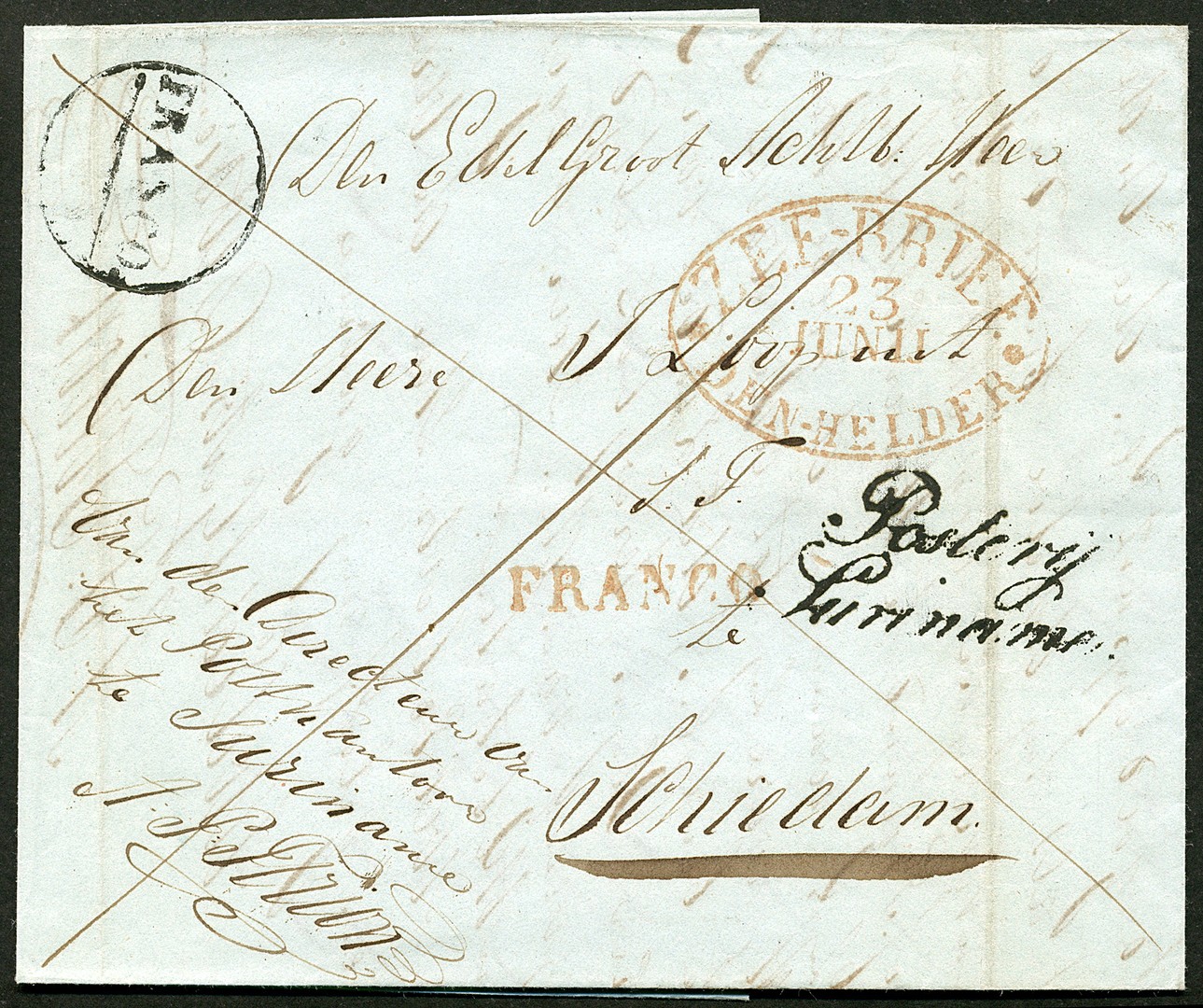 Vouwbrief geschreven door A.P. Tirion, ´Directeur van het Postkantoor te Suriname´, van Paramaribo 1-5-1842 over Den-Helder 23-6 (prachtafdruk Zeebriefstempel PEP2.Z141) naar Schiedam 25-6, met stempelcombinatie ´Posterij/Suriname.´ in cursieve letters en onderstreept ´FRANCO.´ in cirkel, aangevende dat het port vooruit is betaald. In Den Helder werd ook een stempel ´FRANCO´ geplaatst. Op de az. staat het port ´60´ geschreven. Transcriptie bijgevoegd. Een schitterende brief met luxe afstempelingen, afgebeeld in ES.1 op p.28. Tentoonstellingsstuk!