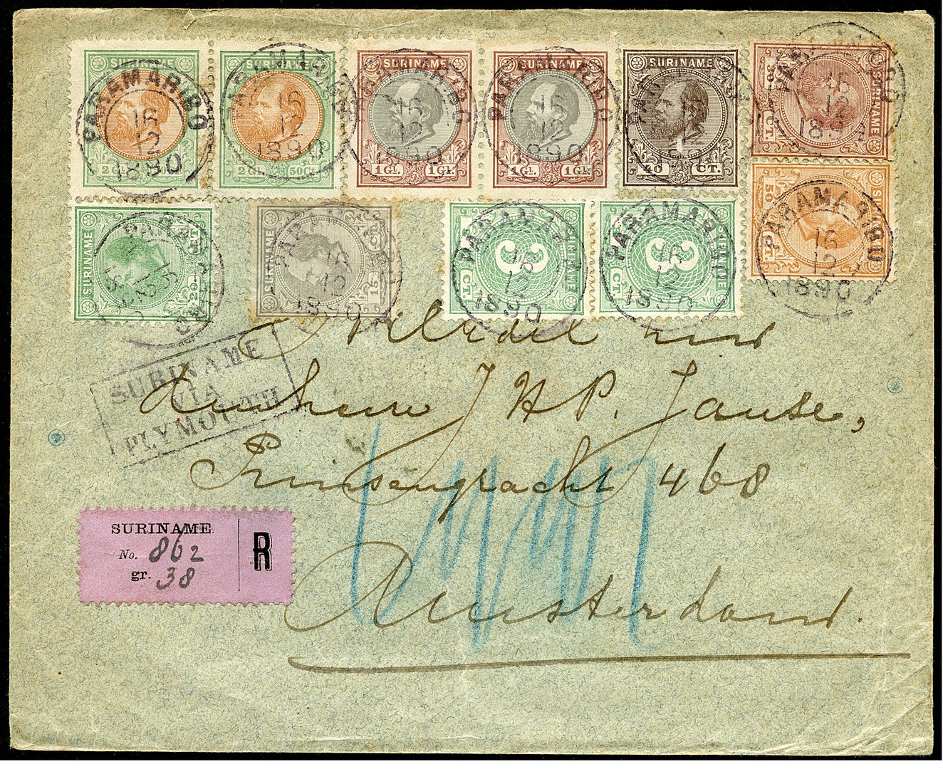 Weelderig gefr. env. van 38 gr. waarop 3c (2x), 15c, 20c, 30c, 40c, 50c, 1 gld in paar en 2½ gld in paar, tezamen fl. 8,61 van Paramaribo 16-12-1890 aangetekend over Plymouth (routest.) naar Amsterdam 16-1-1891. Enkele ex. paar roesttandjes, overigens zeer decoratief stuk