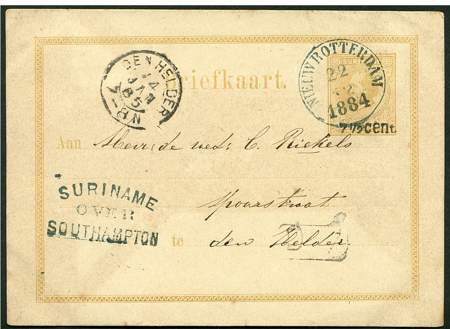 Bk. G5a (iets smoezelig) met superbe blauwe afdruk van het rondstempel Nieuw Rotterdam 22-12-1884 over Southampton (routest.) naar Den Helder 14-1-1885