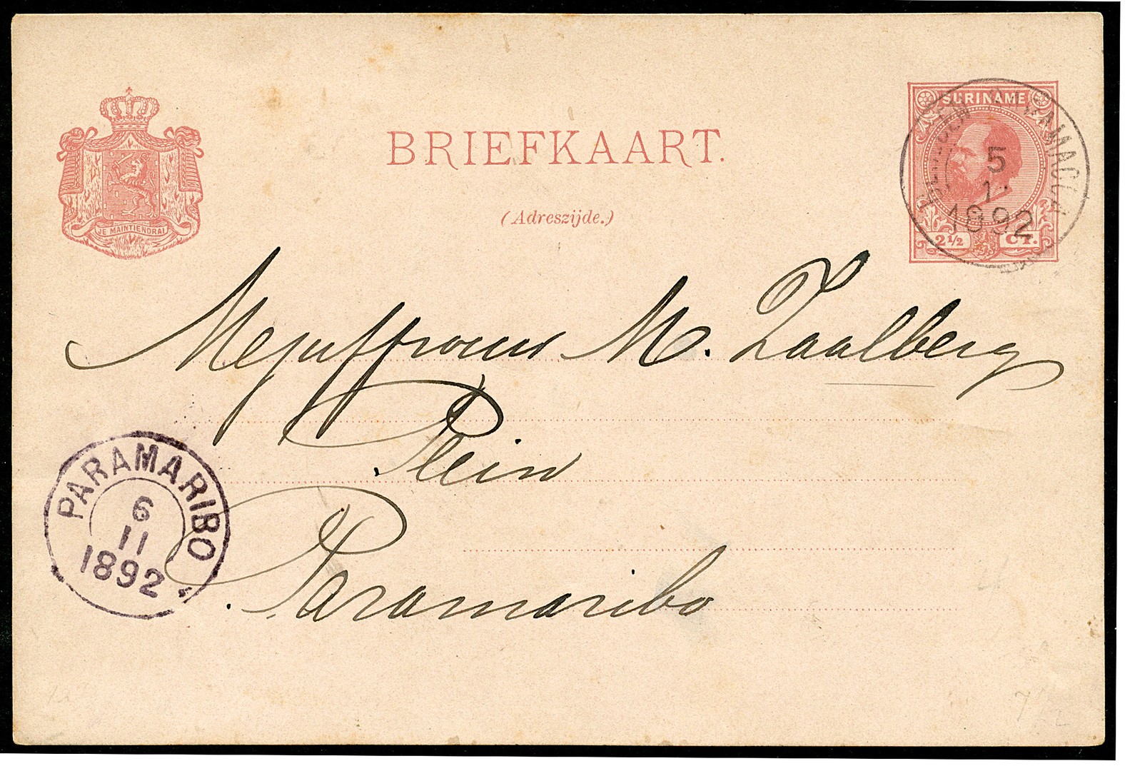 Bk. G7 met lichte, doch goed leesbare en zeer zeldzame afst. BENEDEN SARAMACCA 5-11-1892 in zwart (ES. type 1Aa) naar Paramaribo 6-11. Weinig poststukken met dit rivierbootstempel bewaard bekend!