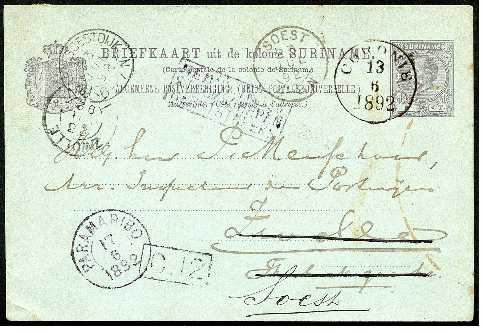 Bk. G9 (wat vlekjes) afgest. met antiqua rondstempel CORONIE met sierlijke letters en cijfers over Paramaribo 17-6 rechtstreeks over zee (routest.) naar een Inspecteur der Posterijen in Zwolle 23-7, doorgez. via Soest 23-7 naar Baarn-Soestdijk 23-7 (zeldzaam kleinrond!)