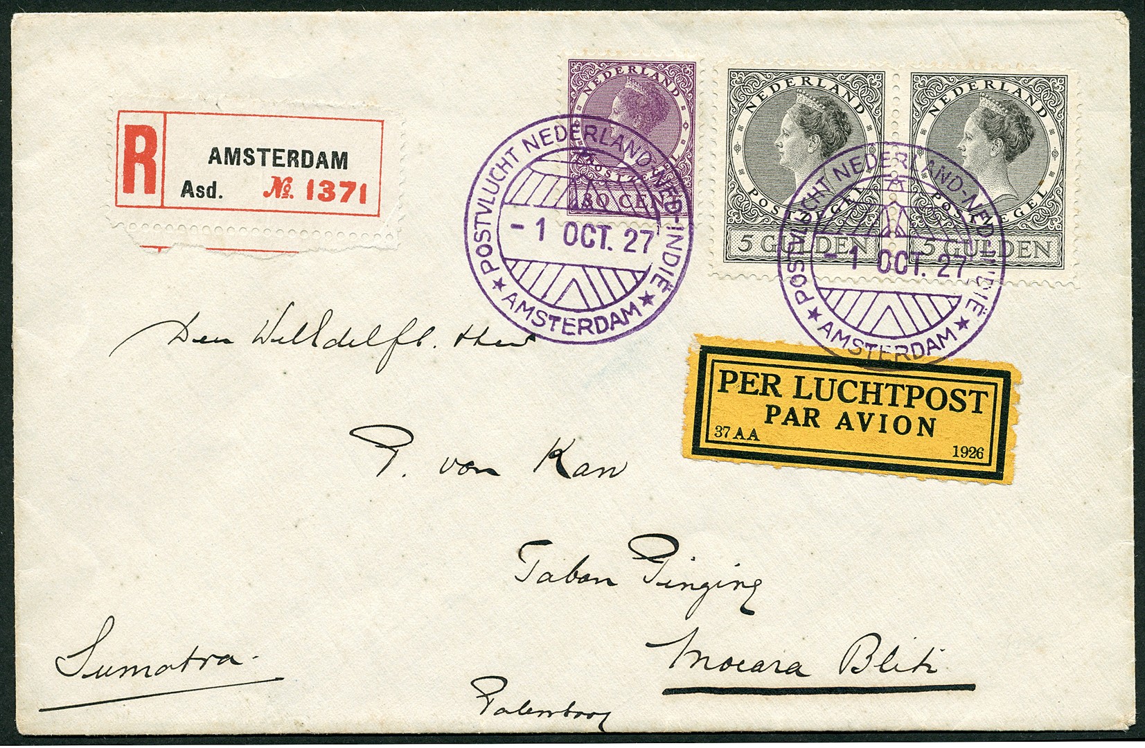 Koppenvlucht, uitlading te Palembang. Prachtcouvert gefr. met 30c en 5 gld Veth in paar aangetekend van Amsterdam naar Palembang 10-10-1927, verder naar het kleine hulppostkantoor te Moearabliti 12-10. Slechts ca. 18 brieven te Palembang uitgeladen. VH.B.14c. ? 175+