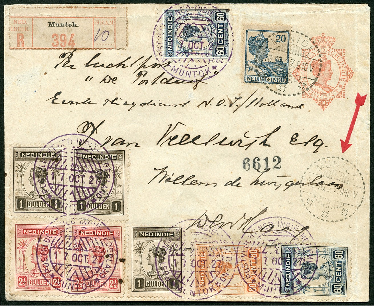 Koppenvlucht, inlading te Muntok. Kleurig en juist gefr. env. van 12½c aangetekend van Muntok 16-10-1927 met vijf speciale afst. met de kantoornaam Muntok 17-10-1927 naar ´sGravenhage 28-10. Slechts 11 brieven te Muntok ingeladen, waarvan naar verluidt zes aangetekende ex. bekend zijn. Ondanks de, niet storende, vouwen rechts en boven in de env. is het een zeer zeldzaam en attractief poststuk voor elke belangrijke tentoonstellingscollectie KLM-Indiëlijn. VH.B.15d. ? 400+