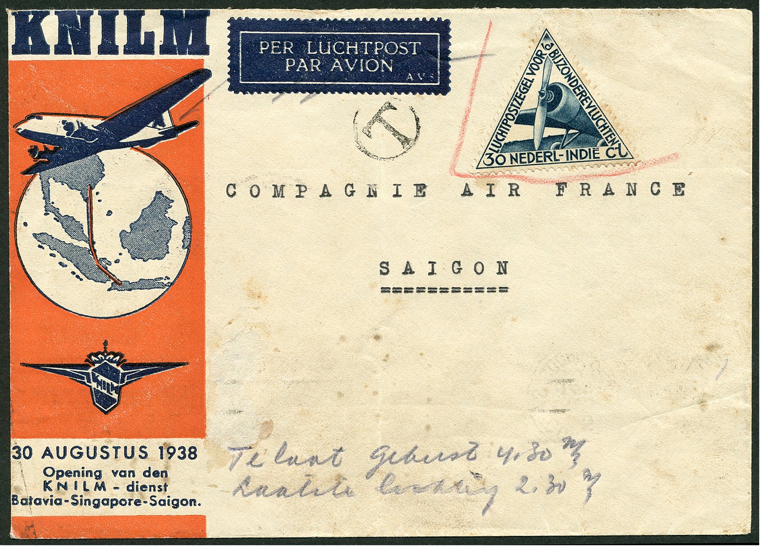 Ned.- Indië. Gelegenheidscouvert voor de KNILM-openingsvlucht Batavia-Saigon op 30-8-1938, maar de afz. heeft alleen de driehoekszegel geplakt en ´Te laat gebust 4.30´ want ´Laatste lichting 2.30´. Toen was de vogel al gevlogen, maar op az. staat ´Aangebr Mdn 1/9 per ¨Emoe¨ en alsnog via Bangkok en Phnompenh 4-9 naar Saigon 5-9