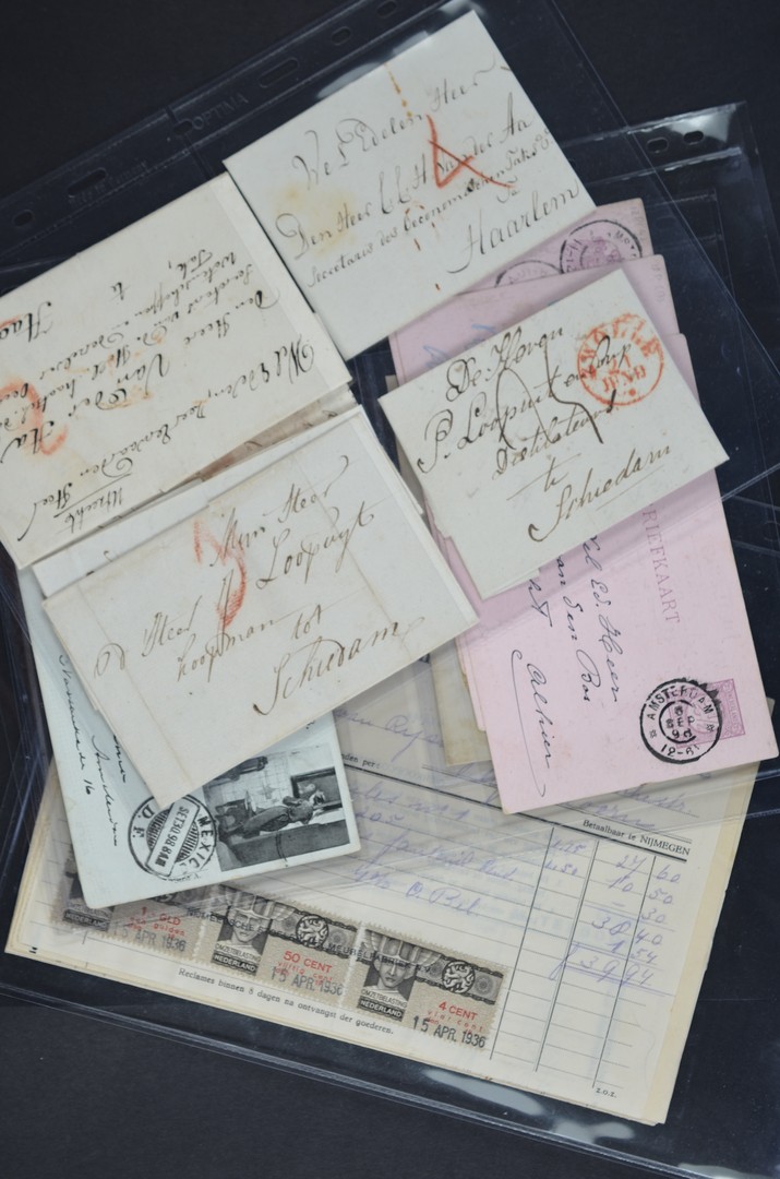 POSTHISTORIE, 5 voorfilabrieven w.o. met geschreven kantoren, MBT-kaarten P33a/d alsmede bijgedrukte env. G5 aangetekend naar Padang (1894), tevens 9 facturen 1936-39 waarop omzetbelastingzegels