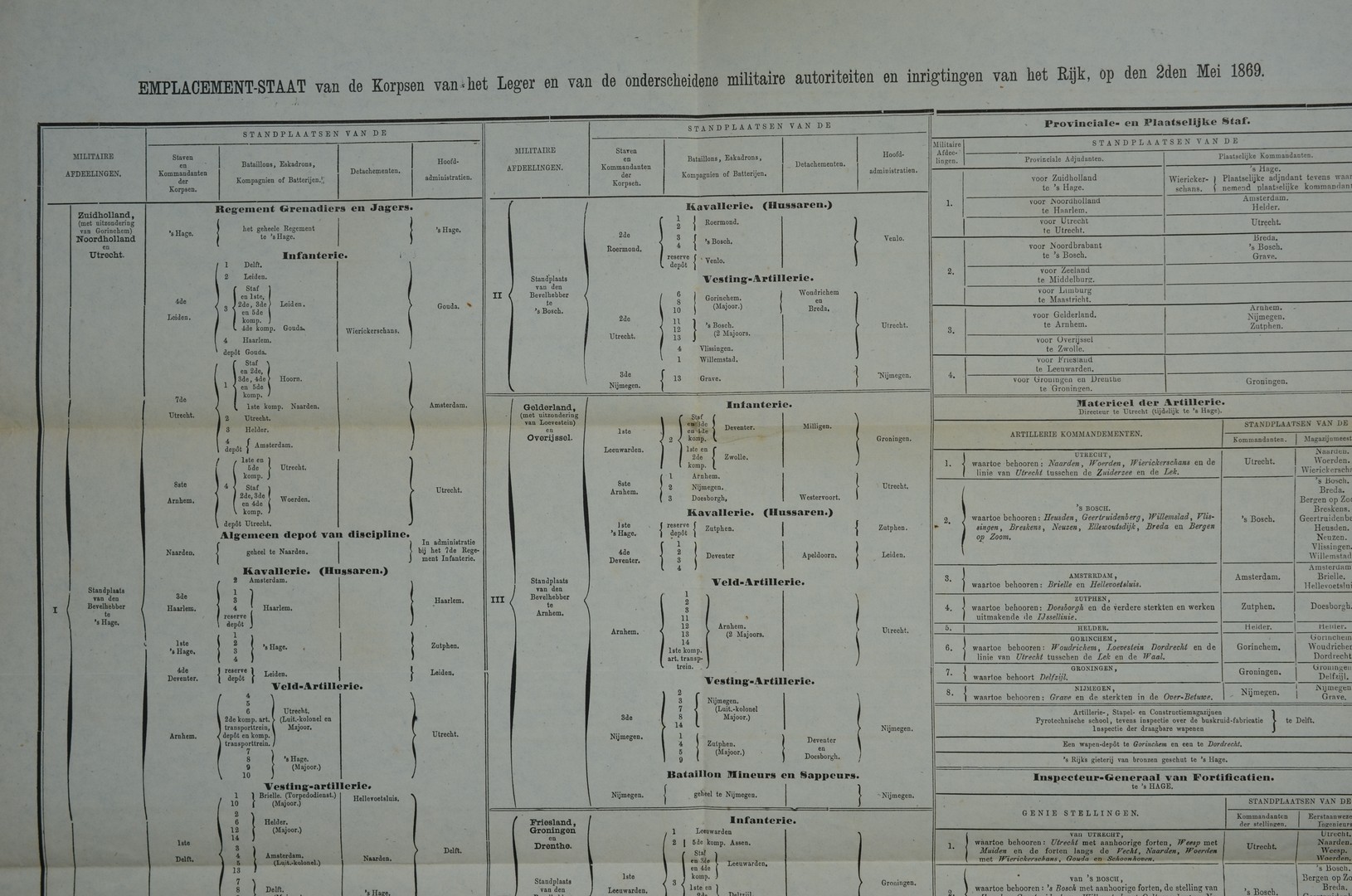 MILITARIA, ´Emplacement-staat van de Korpsen van het Leger en van de onderscheidene militaire autoriteiten en inrigtingen van het Rijk, op den 2den Mei 1869.´ Groot formaat document, als nieuw