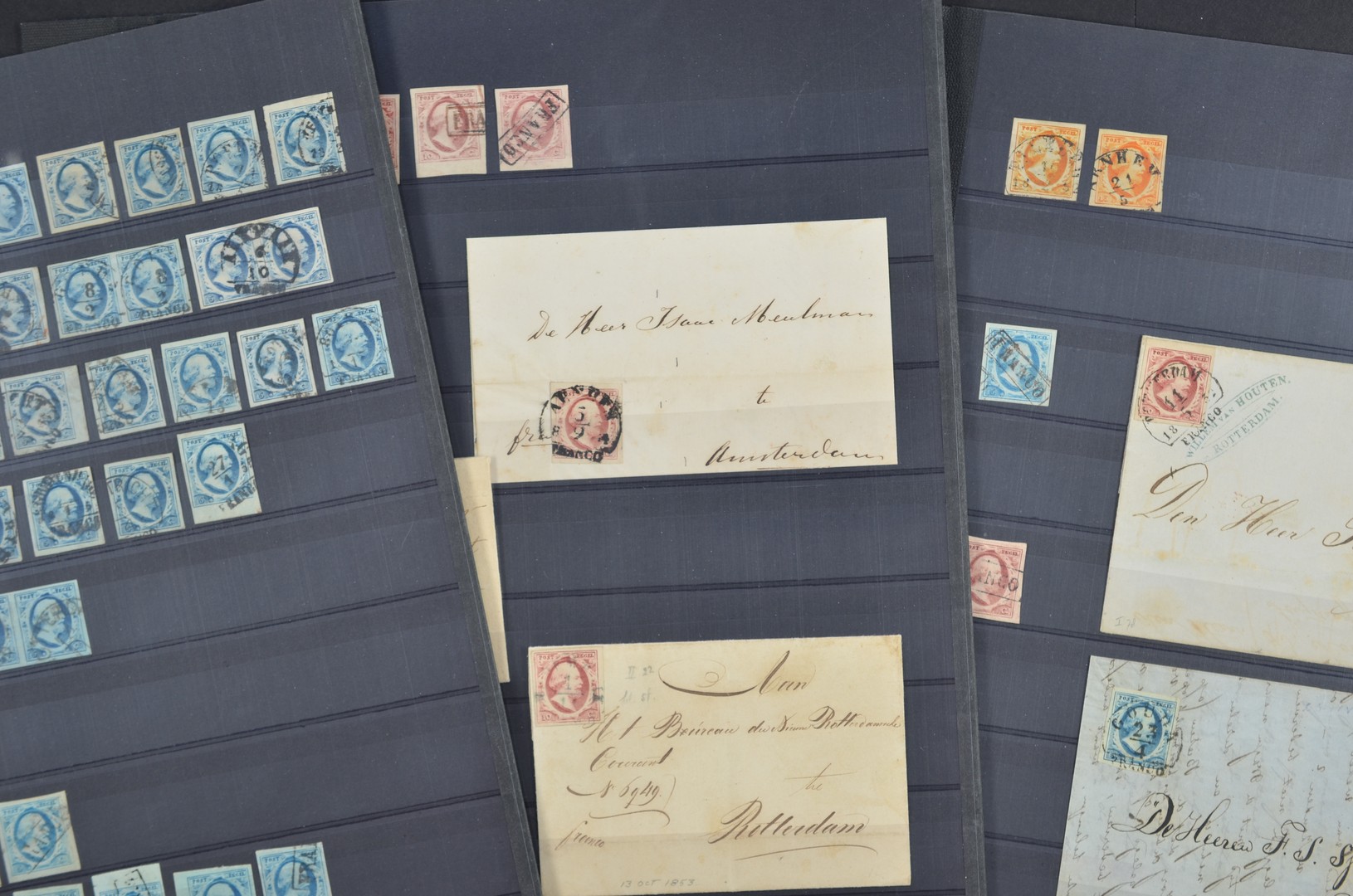EMISSIE 1852, 5 cent (pl.I 10x en 3 paren, pl.II 14x en 2 paren, pl.IV 2x, pl.V 4x, pl.VI 6x), 10 cent (pl.III 2x, pl.IV 3x waarvan 1 ex. Franco in kader, pl.V 13x en 2 paren, pl.VI 13x en 1 paar, pl.VI 2x, pl.VIII 3x, pl.IX 4x, pl.X dik 12x en 2 paren waarvan hoekpaar az. dunne plek, pl.X dun 20x en 1 paar), 15 cent (2x), 5c op brief (2x) en 10c op brief (3x), veel randstukken w.o. met watermerklijn, veelal in uitgezochte kwaliteit!